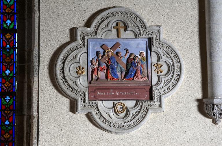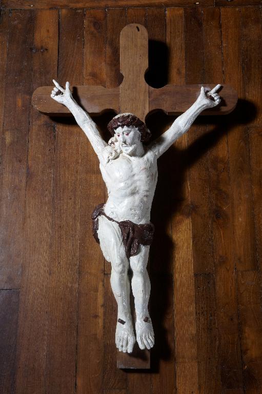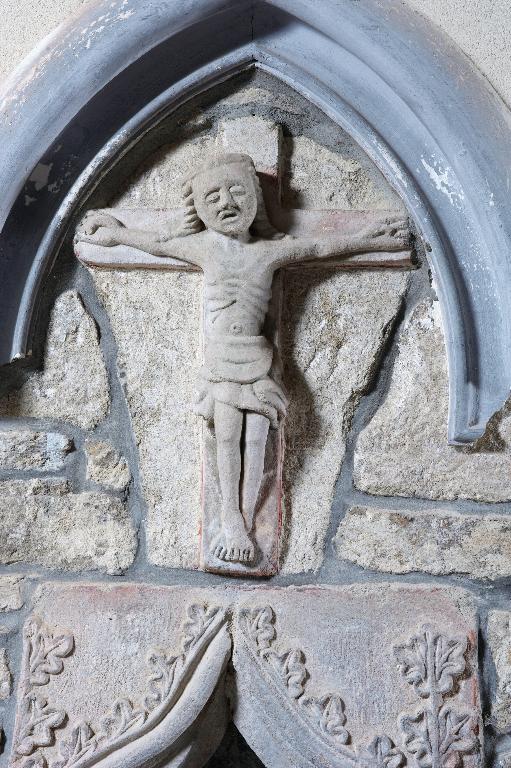 Un bénitier ancien se trouve ainsi à proximité du transept sud. Il s'agit d'un des remplois les plus anciens de l'église. La cuve du bénitier, fichée dans le mur, est richement décorée : elle arbore les visages de deux personnages aux cheveux bouclés, surmontés par un arc trilobé décoré d'ornements végétaux. Le bénitier est surmonté d'un Christ en croix en pierre datable du 15e siècle. La douleur qu'il exprime et la maigreur de son corps sont particulièrement frappantes. Tout comme la cuve du bénitier, il présente des traces de polychromie.
