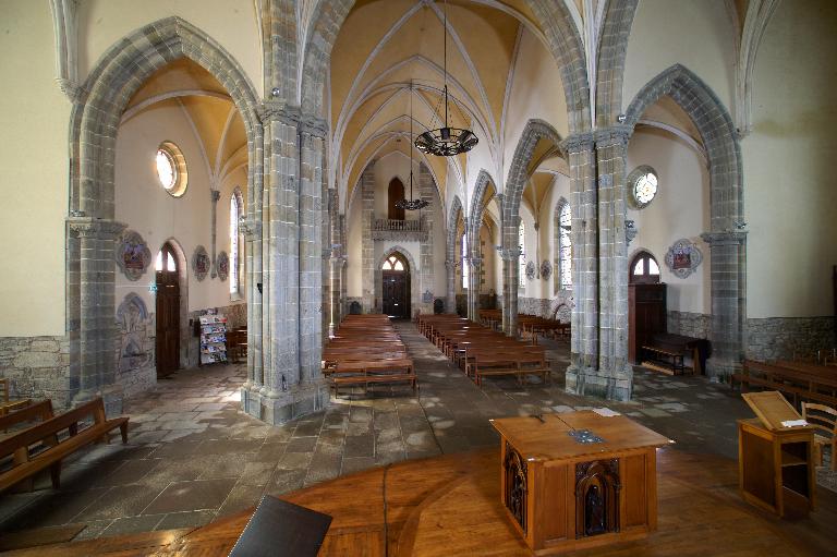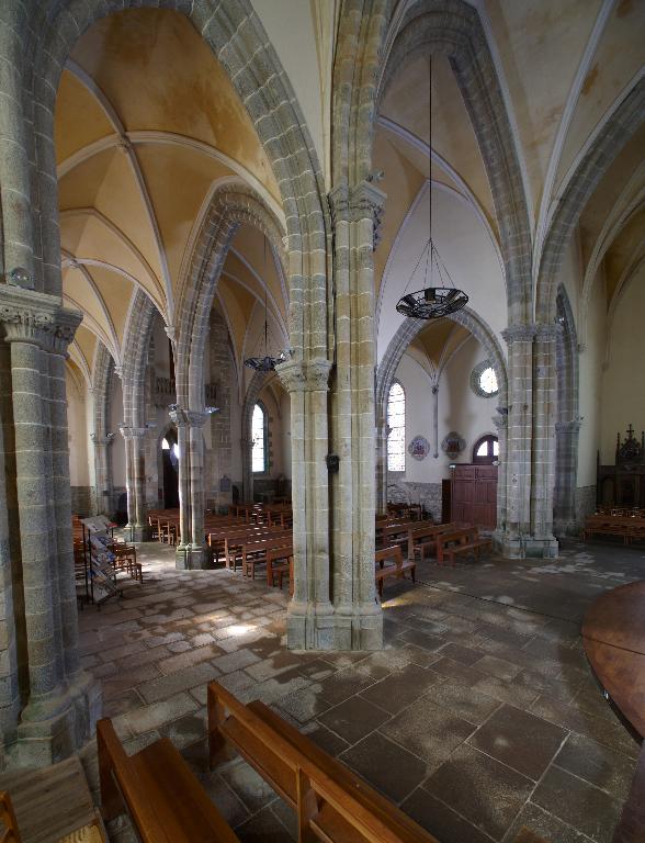A l'intérieur, l'édifice est réparti en 3 travées séparées par des piliers carrés flanqués de colonnes, décorées de chapiteaux arborant des feuilles d'acanthe. Les voûtes d'ogives des bas-côtés reposent sur des colonnettes adossées, portées par un culot sculpté en forme d'êtres grotesques ou monstrueux. Les chapiteaux de ces colonnes sont aussi sculptés de petits personnages en plâtre, semblant supporter sur leur dos le poids des retombées de la voûte. Ce parti pris architectural démontre l'intérêt de l'architecte aux églises gothiques médiévales du Trégor et des alentours. En effet, on retrouve le même type de colonnes supportant la voûte dans le chœur de la cathédrale Saint-Tugdual de Tréguier, siège de l’évêché dont dépendait Rospez, ou dans le vaisseau central de l'église Sainte-Catherine de La Roche-Derrien. Le style néo-gothique de l'église Saint-Pierre et Saint-Paul reste donc inspiré par des édifices médiévaux, dont l'importance religieuse dans le territoire a assuré la pérennité du modèle architectural.