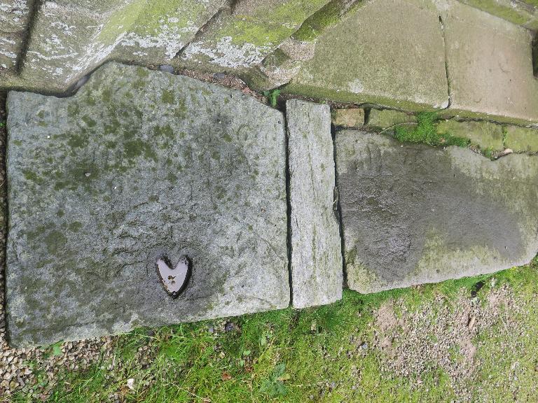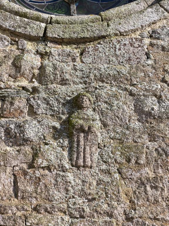 A l'extérieur de l'église, on constate aussi le remploi de plusieurs éléments anciens. D'anciennes pierres tombales en dalle de schiste sont par exemple utilisées pour la pavage du sol au niveau de la porte du transept nord. L'une d'elle porte encore un petit bénitier en forme de cœur. Au dessus de la dite porte, une statuette est fichée dans la maçonnerie. Il est probable qu'elle représente un clerc, moine reconnaissable par sa longue robe et sa tonsure, représenté de manière stylisé.