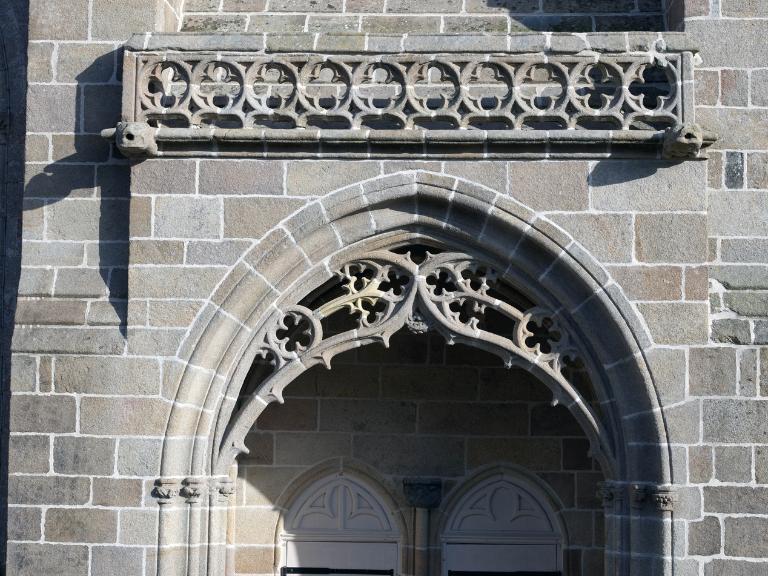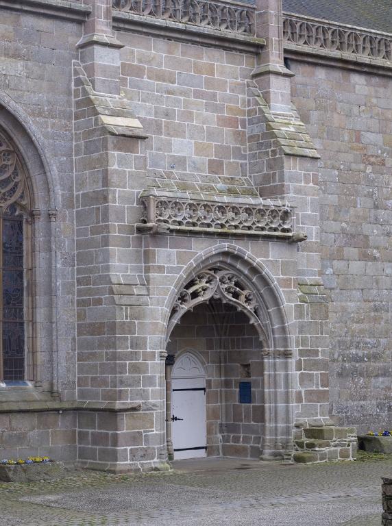 Le porche de Lantic se pare sur le rouleau externe de l’arc d’entrée et l’encadrement de sa porte d’un abondant décor sculpté de pampres de vigne, et d’un feston de trilobes employé dès le début du 15e siècle sur les grands chantiers tels le Folgoët, Locronan, Notre-Dame de Quimperlé ou Kernascléden, décor qui correspond en quelque sorte au style "officiel" imprégné de références françaises. Le porche de Minihy-Tréguier en revanche, ouvre par une simple arcade à colonnettes assortie aux fenêtres et concentre tout l’effet ornemental dans un lambrequin ajouré original : deux larges mouchettes affrontées traitées en orbevoies déterminent une accolade sous la pointe de laquelle apparait une feuille de fougère stylisée et la tête d’un minuscule animal.