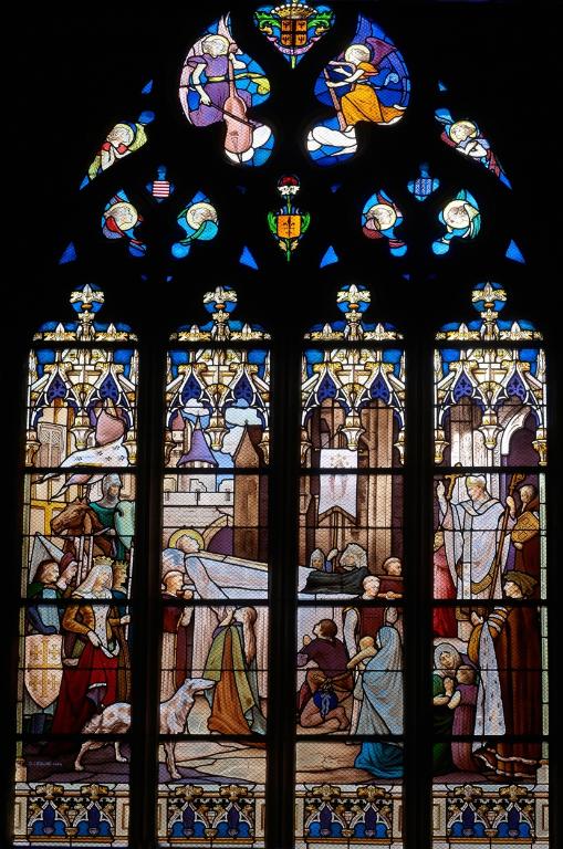 Parmi les nombreuses armoiries portées par les vitraux du crur, celles du cardinal Alain de Coëtivy et de l’évêque Jean de Ploeuc, nous fournissent une fourchette chronologique significative qui se situe autour du milieu du 15e siècle. Celle-ci est en outre confortée, au bas de la maitresse vitre par "deux représentations d’un gentilhomme et d’une damoiselle, où sont lesdictes armes de Loquevel et de Kermartin en alliance", probablement Yves de Quélen, seigneur de Locquenvel, héritier de Kermartin et Jeanne du Perrier de la branche du Méné, mariés au cours de la première moitié du 15e siècle.