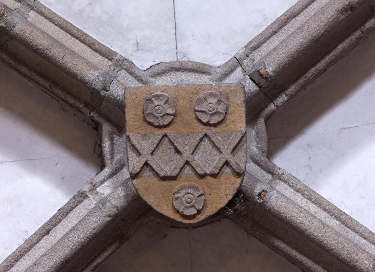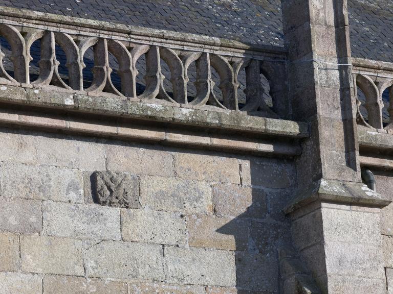 Un autre écu qui orne la clef de voûte de la troisième travée porte les armes de la famille Touronce, "de gueules au chef endenché d’or chargé de trois étoiles de sable", famille mentionnée parmi les nobles de Plouzané (Finistère) dès le 14e siècle. Un de ses membres, Guillaume Touronce était chanoine et official de Tréguier au milieu du 15e siècle. La présence des armoiries de ce personnage important, chargé de rendre la justice au nom de l’évêque peut aussi s’expliquer en référence à "l’illustre official" que fut Yves Hélory au 13e siècle. Les armoiries de ces dignitaires sur un bénitier et sur des clefs de voutes, seules conservées aujourd’hui parce que peu visibles ou hors d’atteinte, confirment donc bien la chronologie proposée par le style de l‘architecture et qui correspond à une reconstruction massive du milieu du 15e siècle. Les armoiries de ces trois ecclésiastiques, jointes à celles des évêques peintes sur les vitraux formaient en quelque sorte un contrepoint significatif aux armes de la famille de Kermartin et de ses alliés et montraient que derrière les multiples et ostentatoires marques d’honneur de la noblesse, c’est bien le clergé qui était au commande, ce que s’empresseront de rappeler les différents évêques en invoquant le texte du testament de saint Yves lui-même.