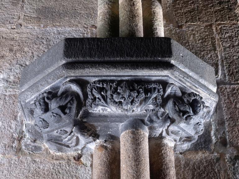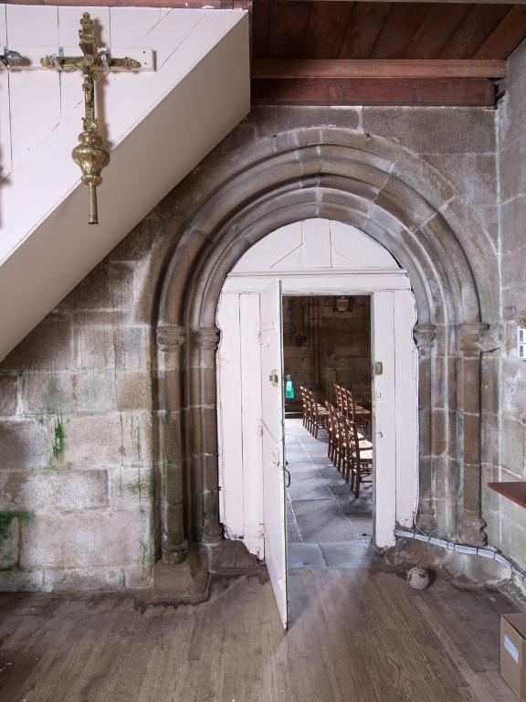 Au revers de l’arc d’entrée, les bases des colonnettes entaillées et la trace des banquettes latérales supprimées correspondent à la transformation du porche, en sacristie, à une époque sans doute assez ancienne. Au fond, les deux portes, en arc brisé surligné d’un simple tore, sont séparées par un trumeau dont la colonnette supporte un culot en "tuffeau vert", sculpté d’un ange tenant un écu buché qui devait probablement porter les armes de Kermartin. On peut s’interroger sur le choix de ces doubles portes, celle de gauche conduisant vers le chœur et celle de droite vers le bas de la nef. N’y avait-il pas initialement le projet d’installer entre les deux une séparation qui aurait déterminé comme un "avant-chœur", réservé à la noblesse, auquel le chapelain depuis sa porte au sud aurait lui aussi eu un accès direct ?