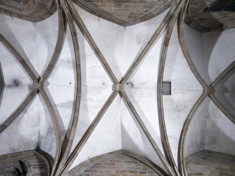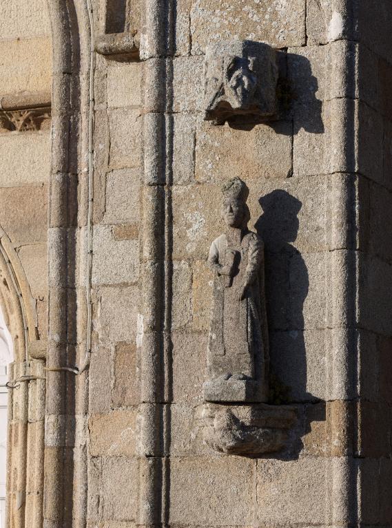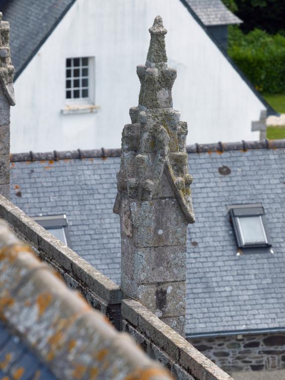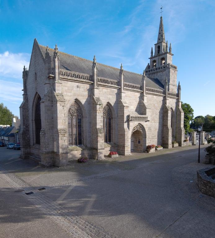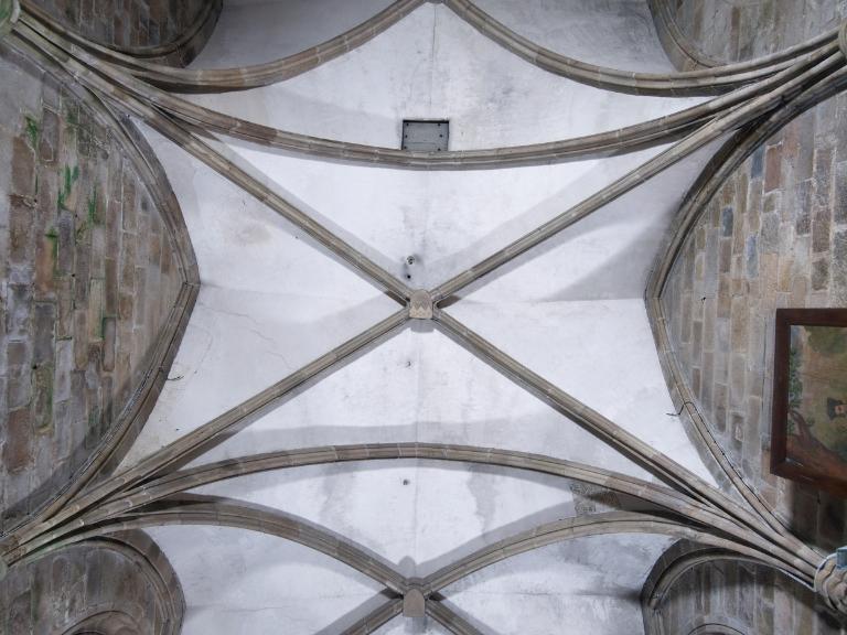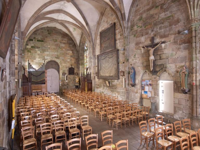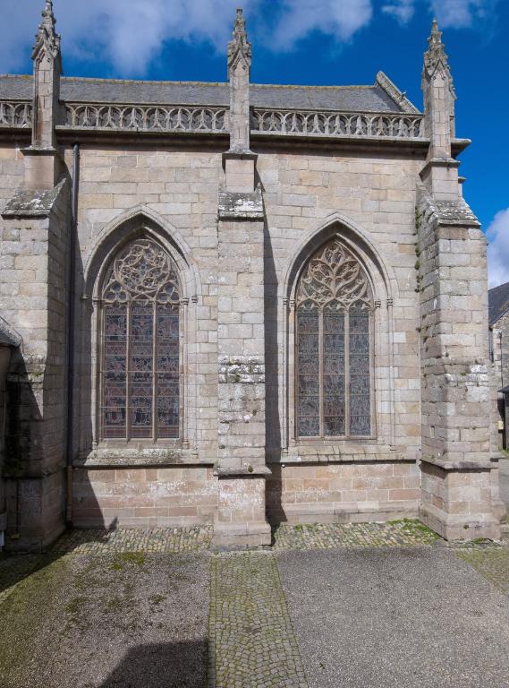 L’église actuelle comprend cinq travées desquelles il faut ôter celle de l’ouest, ajout sous forme de pastiche effectué au premier quart du 19e siècle lors de la transformation de l’ancienne chapelle en église paroissiale. S’appuyant sur la date de la canonisation de saint Yves en 1347, certains auteurs ont voulu voir par erreur dans le chœur de la chapelle les traces d’un premier agrandissement effectué dès le 14e siècle. On ne peut souscrire à cette version. Les ébrasements de fenêtres, traités à l’identique à l’extérieur comme à l’intérieur - ce qui d’ailleurs témoigne de la richesse de la construction - datent indubitablement du milieu du 15e siècle. Leur large cavet encadré de deux arcs à minces colonnettes, se retrouve à l’identique sur la chapelle funéraire de Jean V construite contre le flanc nord de la nef de la cathédrale de Tréguier à partir de 1442. Les bases en flacons et les chapiteaux à bourrelets végétaux sont également caractéristiques du milieu du 15e siècle, de même que le réseau dense des fenêtres dans lequel apparaissent timidement les formes flamboyantes. Le simple examen des éléments de style de l’architecture, ainsi que celui des armoiries présentes dans les clefs de voûtes et sur un bénitier, exclut d’emblée de souscrire à la version donnée par René Couffon qui interprétait la mention dans une pièce d’archive de la réfection de la "voûte" de la chapelle en 1418 comme point de départ de la construction actuelle et l’antidatait considérablement en la faisant remonter au 14e siècle. En réalité il n’en est rien et il faut sans doute interpréter le terme de "voûte" employé couramment de manière générique dans les actes anciens, comme désignant dans ce cas une charpente lambrissée déterminant une fausse voûte.