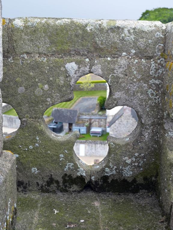 Ainsi qu’on l’a vu plus haut, le bénitier de la porte sud porte deux fois les armes d’Yves le Du, chapelain de saint Yves de Kermartin vers 1445. Selon le procès-verbal de 1601, ces armoiries surmontaient également la porte piétonne de l’entrée du manoir de la chapellenie, au sud de la chapelle, tandis que l’arc de la porte charretière portait les armes de Kermartin. Enfin ces mêmes-armoiries se retrouvent sur trois des cheminées du manoir que leur style situe parfaitement au milieu du 15e siècle, ceci confirmant la construction concomitante et même l’unité de conception de l’ensemble chapelle et maison de la chapellenie autour du milieu du 15e siècle. A l’évidence, le chapelain de saint Yves de Kermartin, doté de revenus suffisants pour se faire reconstruire un confortable manoir, assorti d’une métairie, au sud de sa cour close, et d’un imposant colombier, se comportait comme un véritable petit seigneur ecclésiastique.