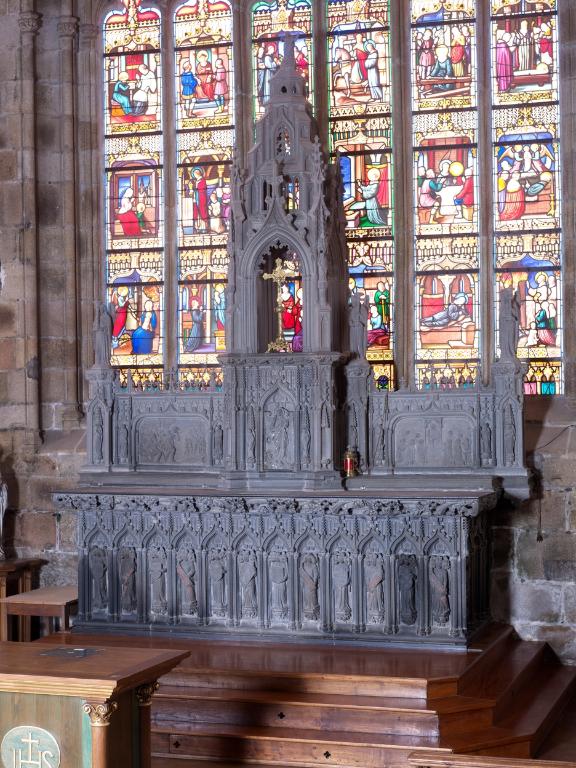 Les interventions effectuées à partir du milieu du 19e siècle furent plus heureuses, tout d’abord la sacristie ajoutée contre le flanc sud en 1853, dans un style néo-gothique sobre qui s’intègre discrètement entre deux contreforts. Dans les années 1860, l’afflux des dons des fidèles et l’implication du maire, le comte Aymar de Roquefeuil, résidant sur le domaine du Bilo, au nord de la commune déclenche une restauration générale de l’intérieur de la chapelle. Celle-ci commence par l’installation de riches vitraux réalisés par l’atelier du Carmel du Mans et en particulier de la maitresse-vitre consacrée à la vie de saint Yves. L’enrichissement et le renouvellement du mobilier se poursuit en 1872 avec la commande du maitre-autel à l’architecte Claude-Joseph Lageat, autel dont la haute qualité se veut à la hauteur de la ferveur de la dévotion. Ce dernier conçoit une œuvre spectaculaire qui reprend comme modèle l’autel des saints anges du Folgoët, réalisation majeure de la sculpture gothique du 15e siècle en Bretagne, la sculpture étant confiée au très talentueux Jean Larchantec de Morlaix. De part et d’autre de l’ange central qui présente les armoiries de saint Yves, les autres anges du Folgoët présentent le nom ou les armoiries des différents personnages ayant témoigné lors de l’enquête pour la canonisation de saint Yves en 1347, ils encadrent. La prédelle qui illustre d’un côté le thème de la parabole du sarment de vigne et de l’autre la Cène est ponctuée de quatre anges ceroferaires dont le principe évoque une disposition propre aux autels médiévaux. Elle encadre un monumental tabernacle et dais d’exposition pour lequel Jean Larchantec a produit là un chef d’œuvre qu’il a d’ailleurs signé sur la plinthe du côté droit de l’autel. Là encore c’est sans doute le Folgoët et en particulier les élégant dais ajourés du porche des apôtres, à l’origine de tant de successeurs dans les enclos léonards qui ont pu servir de modèle. La datation de la très belle crédence liturgique qui jouxte l’autel à sa droite est délicate : on serait tenté au premier regard d’y voir une œuvre du 15e siècle miraculeusement préservée, en réalité il s’agit plus probablement d’une très belle réinterprétation du 19e due au talent du même maitre morlaisien.