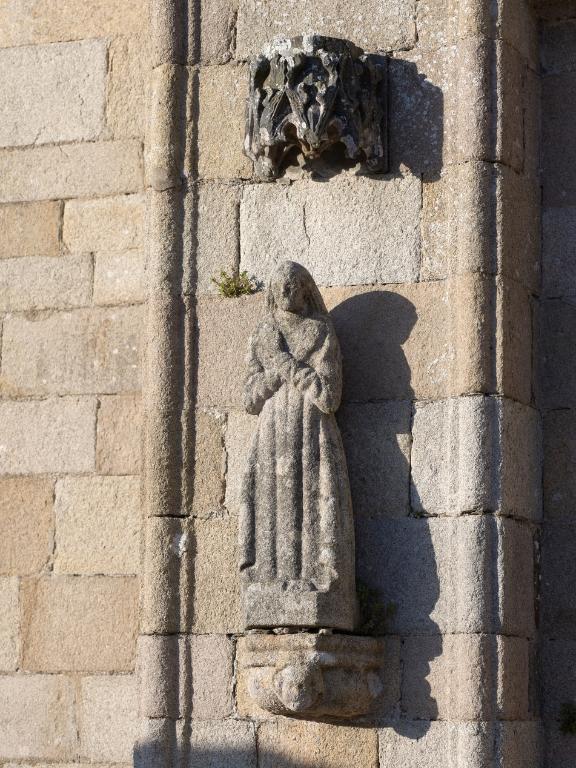 Dans les parois latérales du porche enfin, deux niches d’origine, placées en hauteur et qui se font face, comportent dans leurs angles supérieurs des rainures visiblement destinées à recevoir et bloquer un coffret. Cette disposition tout à fait originale, et à ce jour unique en Bretagne permet d’envisager que le porche de la chapelle de Minihy-Tréguier fut conçu pour un autre usage occasionnel, probablement celui de servir lors du pardon et des grandes fêtes, à exposer des reliques du saint dans les niches de ses parois.