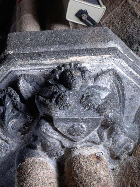 Adossés à la clôture du chœur, du côté de la nef, deux autels secondaires reprenaient une formule habituelle dans les sanctuaires médiévaux. L’autel "à main gauche à la sortie, du dit cœur", est non armorié, mais la vitre qui l’éclaire présente les armes des seigneurs de Crechmartin, juveigneurs des seigneurs de Kermartin, et en contrebas un banc seigneurial et une tombe sont marqués des mêmes armes. Au pied de l’autel de droite, "près du benettouer, comme l’on entre dans la ditte chapelle du côté de la maison de la chapellenie", se trouve un autre tombeau aux armes de Kermartin. Cet imposant bénitier en tuffeau vert qui embrasse le faisceau de colonnettes de la deuxième travée, près de la porte de la chapellenie a été heureusement conservé. Les armoiries sculptées à ses deux extrémités, peu visibles à moins de se baisser, ont échappé à l’inventaire de 1601, mais aussi à la vindicte révolutionnaire. Ces armoiries présentées par des anges et qui se lisent "de sable à la fasce d’argent accompagné de trois coquilles de même", sont celles d’Yves Le Du, en français Le Noir et en latin Niger, chapelain de saint-Yves aux alentours du milieu du 15e siècle, personnage important dans la reconstruction de la chapelle, sur lequel nous reviendrons plus loin.