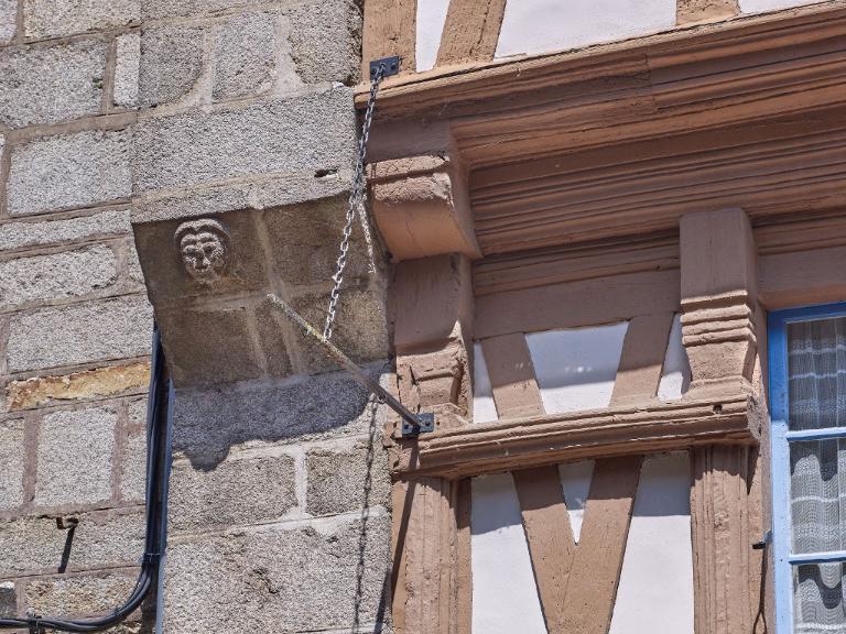 Trois abouts de poutres débordantes supportent l'encorbellement de chaque niveau. Sablières et entretoises sont moulurées, de même que les poteaux principaux. Une lisse haute et basse filante encadrent les fenêtres et se poursuivent sur les parties aveugles. Une croix de Saint-André contrevente les extrémités du premier étage ; une simple écharpe au deuxième.