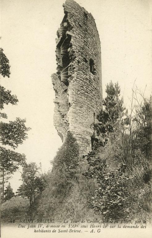 L’Annuaire des Côtes-du-Nord (1875) nous donne cette description : "Substruction de l’ancien castrum de Cesson, servant en quelque sorte de base à la tour qui lui a succédé. En avant de la tour et se développant vers la mer, enceinte fortifiée dont le parapet supérieur, offrant la figure d’un trapèze irrégulier, n’avait pas moins de 480 m de développement et était renforcé sur certains points par un deuxième retranchement ; ces travaux ont été détruits il y a une vingtaine d’années, pour faire place à des jardins. Au Sud de la tour, substructions assez étendues, sur lesquelles on avait bâti probablement, au 14e siècle, une chapelle destinée au service de la garnison".