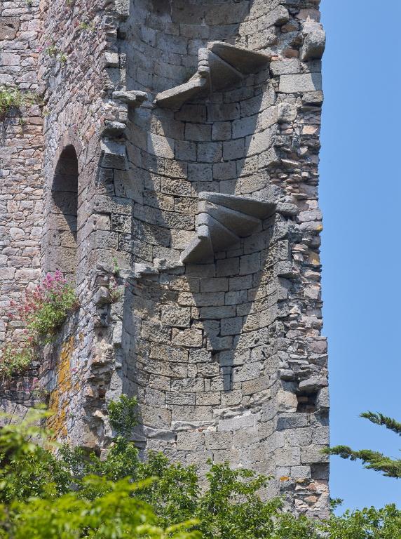 - à l’Est de la tour, une masse de terre longiforme, grossièrement orientée Est-Ouest, peut être observée sur près de 200 mètres. Le cadastre parcellaire de 1814 figure deux demi-bastions de part et d’autre. Cet élément pourrait correspondre à la courtine du château fort démantelé à la fin du 16e siècle et terrassé au 19e siècle (courtine dans laquelle Habasque écrit avoir vu, vers 1834, quatre casemates). Cette courtine protégeait la parcelle appelée "Les Belles", d’une superficie de 2 200 m2 et qui désigne probablement l’emplacement de l'ancienne basse-cour.