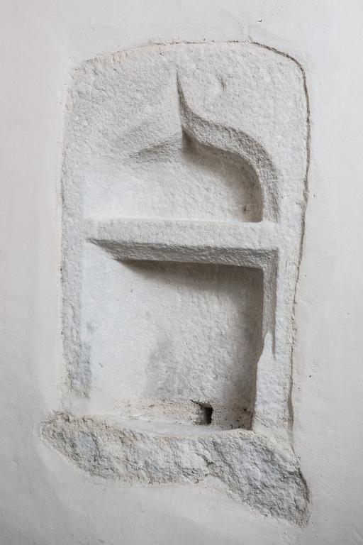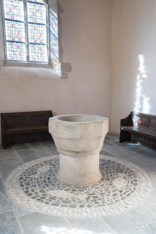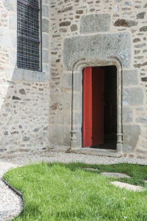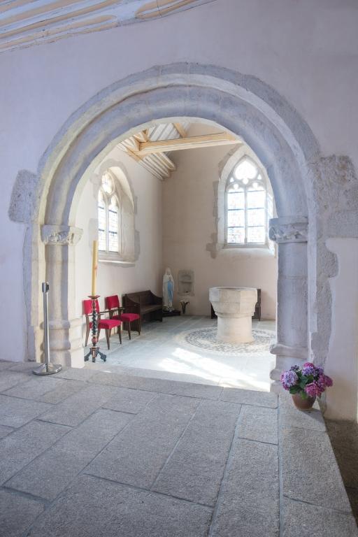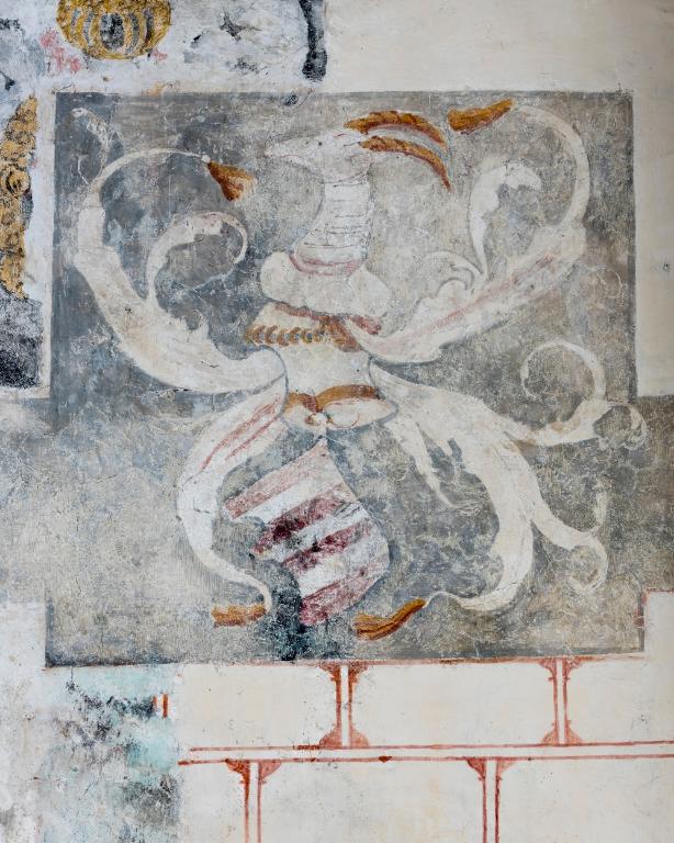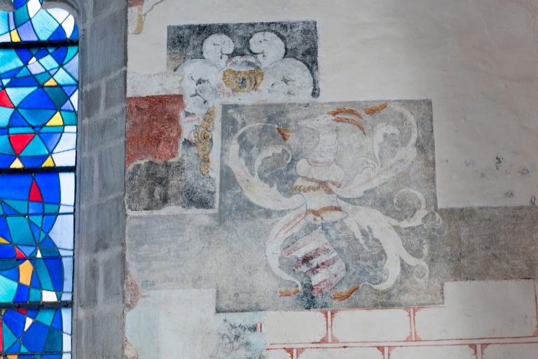 Du 14e siècle subsiste, à gauche de la baie un personnage dont on aperçoit la tête et la main. Il semble reprendre le même geste que le Christ situé au-dessus. Ce petit personnage bouclé et souriant se réfère à l’ange souriant de Chartres du 13e siècle mais également à l’art de l’enluminure du 14e siècle à la cour de France. Le même faux appareillage peint se retrouve également dans le réfectoire de l’abbaye de Léhon. Celui à la moucheture d’hermines est plus ancien que celui décoré de fleurs de lys de la fin du 15e siècle. Deux litres seigneuriales, sur fond noir, sont peintes à des époques différentes. Les armoiries de la litre plus petite ne sont pas identifiables. Celles de la litre plus grande présentent à gauche, les armes des Ferré, d’argent à une face d’azur et trois molettes surmonté d’un heaume avec cimier et panache représentant un aigle aux ailes déployées, et à droite de la baie : le blason des Quédillac, de gueules à trois fasces d’argent surmonté d’un cimier et d’un panache à tête de chèvre. Le contrat de mariage entre Catherine de Quédillac et Bertand Férré attesté en 1512 permet de dater de la première moitié du 16e siècle ce décor peint. Enfin des vestiges d’un décor d’accompagnement du retable a été réalisé à la fin du 19e siècle par D. Lavenant, peintre à Saint-Brieuc.