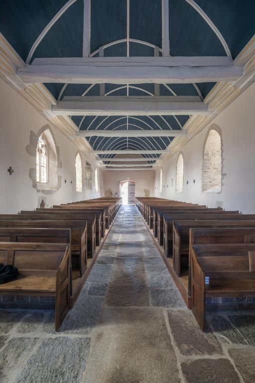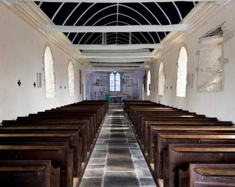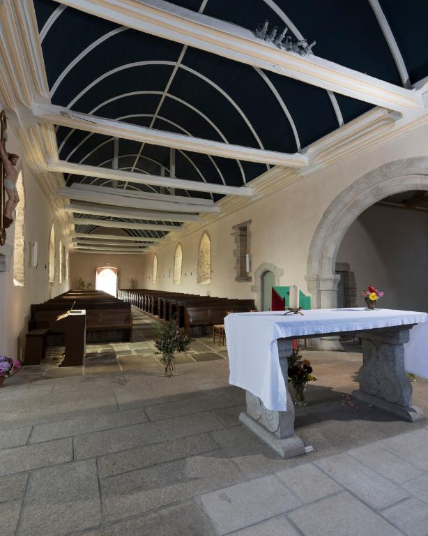 Au-dessus de la charpente du chœur a été récemment découverte une peinture murale du 14e siècle représentant le Christ auréolé d’un nimbe crucifère. Il lève les bras, les paumes de ses mains sont tournées vers nous. A ses côtés un chandelier d’autel à trois branches et d’autres signes non identifiés semblent flottés sur un fond blanc. Cette représentation est exceptionnelle et rare. Il peut s’agir d’une scène du jugement dernier avec la résurrection des morts, comme celle de la chapelle de Locmaria er Hoët sur Landévant.