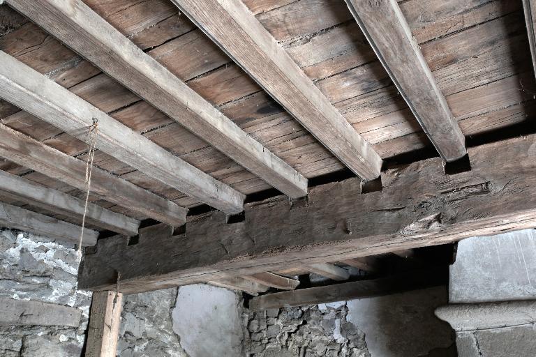La charpente de la dépendance maintient sur un arbalétrier une échelle réalisée avec des chevilles de bois pour le montage des pannes. Ce détail technique est rarement conservé.