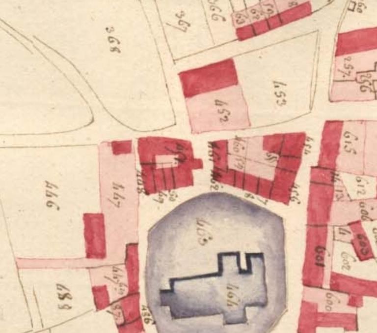 Parcelle formant un ilot au nord de l'église paroissiale. Grand jardin latéral à l'est du logis.