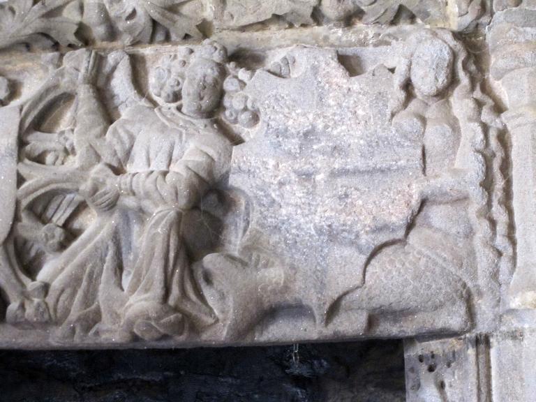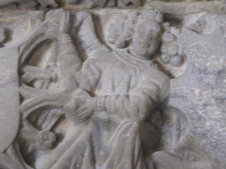 Le décor du trumeau de la cheminée est orné de trois blasons martelés de formes différentes dont des cuirs soutenus par des tenants : un sauvage, à gauche, deux anges au centre, et une sirène à droite. La forme des écus et le style de la sculpture indiqueraient une datation proche du début du 16e siècle. Les armoiries sont difficilement identifiables, celles de gauche un mi parti écartelé avec une croix, celles du centre trois têtes d'animaux, celle de droite un écartelé sans pouvoir le décrire davantage.