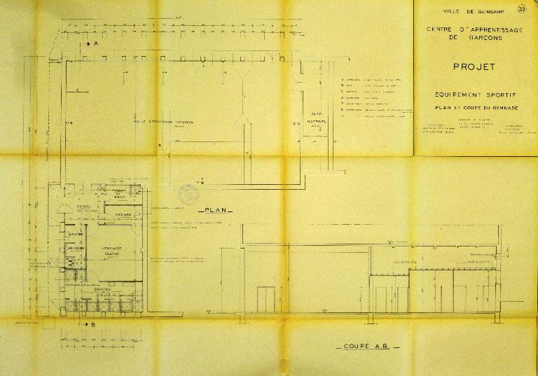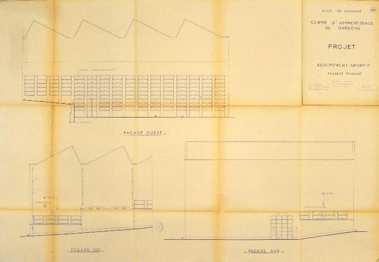 Ce petit gymnase de 19,48 m sur 12 m ne répond pas aux dimensions standard des salles de sport scolaires. Il possède la singularité de se trouver au rez-de-chaussée d'un des ateliers du lycée. De ce fait, le bâtiment présente une toiture à sheds, caractéristique du monde de l'industrie, formée d’une succession de toits à deux versants de pente différente, dont le plus court est vitré, orienté vers le nord, de façon à avoir un éclairage constant. Celui-ci ne bénéficie qu'aux ateliers, le gymnase étant pour sa part éclairé par les baies de sa façade ouest.