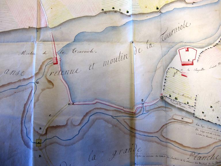 Plan de la partie du fond de la plaine de Mordreuc contenant les anses de la Tourniole et de la Grande Planche relatif à la pétition présentée par le Sr Claude Mehouas en l'an onze tendant à l'obtention d'une concession de l'anse de la Grande Planche pour y construire un moulin à marée. Le dit plan levé par nous soussigné ingénieur ordinaire de 1ère classe du cors impérial des Ponts et Chaussés, et joint à notre rapport sur la dite demande en date du 25 mai 1807. Lamballe le 25 mai 1807. Ch. Mauger (A.D.22 : 1Q1/19)