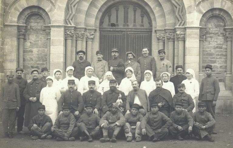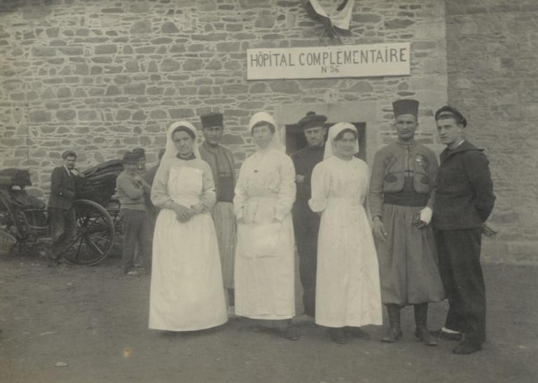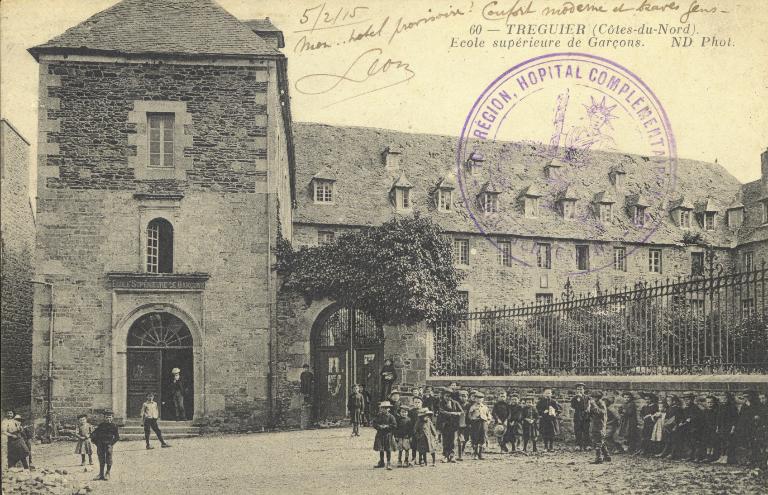 Pendant la Première guerre mondiale, l'établissement est en partie réquisitionné pour accueillir un hôpital complémentaire : 9000 soldats au total y seront soignés entre 1914 et 1918. Henri Pollès dans son roman intitulé "Sur le fleuve de sang vient parfois un beau navire" (1982) évoque cet épisode dans l'histoire de Tréguier : C’était devant la porte du Complémentaire (dont on peut se demander de quoi, puisqu’il était l’hôpital principal ; peut-être de l’insuffisance du plan sanitaire général…) qu’avait lieu le premier tri des « arrivages ». D’après la fiche épinglée sur la capote et un rapide examen, on gardait l’un, on aiguillait l’autre vers les diverses annexes. Parfois l’opération était assurée par de simples infirmières, tout de même triées sur le volet on s’en doute, et certains jours de fièvres, où il y avait de l’électricité dans l’air – il semble qu’en voici un -, les charmantes et distinguées « petites sœurs laïques des pauvres soldats » accréditées par leurs établissements respectifs, se disputaient aussi bien les blessés debout que ceux des civières, selon la spécialité de leurs services et sans doute plus encore les préférences personnelles des chefs pour telles ou telles sortes de blessures…". La cohabitation entre la direction de l’établissement, les élèves et les blessés est dénoncée : "la promiscuité gênante vis à vis des hospitalisés" commence à influer sur le fonctionnement normale de l'école, les "Boches" comme on les surnomme à l’époque sont accusés de "vols et déprédation" et en 1918, un soldat soigné à l'hôpital a fait irruption dans une des classes de l'école primaire avec un couteau.