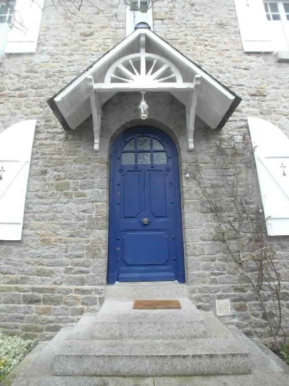 La façade antérieure est composée de trois travées ordonnancées. La porte d’entrée est protégée par un petit auvent en bâtière pourvu d’une ferme ornementale rayonnante. Contre le pignon est, un bow-window sert de support au balcon de la porte fenêtre du 1er étage. Les ouvertures du rez-de-chaussée sont en arc en plein cintre ; celles de l’étage sont rectangulaires. L’ouverture de l’étage de comble est surmontée d’un fronton triangulaire. Un toit à croupes à coyau accentué et fort débordement couvre l’ensemble. Les contrevents, percés d’hermines sont également du dessin de l’architecte.