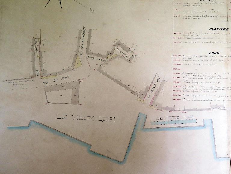Outre les quais, l’espace portuaire comprend également la rue Quelen (il s’agit en réalité d’une petite impasse), le placître Kerderrien et la rue du Pont qui démarre au bas de la rue des Bouchers (actuelle rue Saint-André) et qui se poursuit vers le pont Canada (actuelle rue Marcellin Berthelot). Sur le "vieux quai" se dressent des bâtiments organisés autour d’une cour appartenant en 1906 aux enfants Le Normand. Dans le passé, ces bâtiments ont abrité une manufacture d’huile.