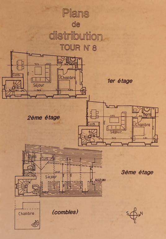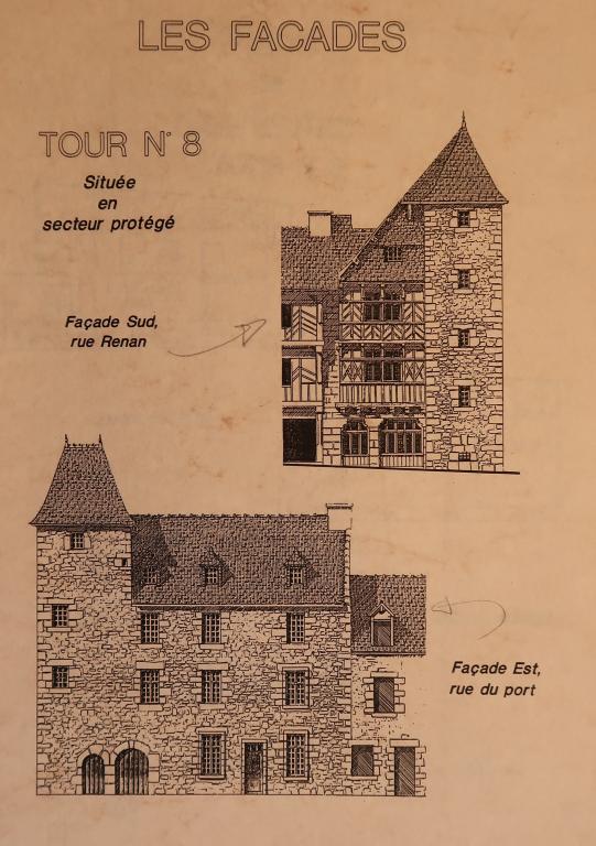 La maison située au nord de la rue (actuellement 8 rue du Port) présente des armoiries (aujourd’hui martelées et illisibles) sur la façade sud de la tour. Sa façade principale côté Jaudy a été remontée en pierre au 19e siècle sans doute à la place d’une ancienne façade en pan de bois, tandis que la partie nord semble avoir été agrandie. Des traces de portes hautes, murées dans le parement de la tour, pourraient être celles d’une petite galerie de jonction entre les étages en pan de bois et la tour, selon un dispositif semblable à celui, daté 1610, de la maison située au sud de la rue. Cette distribution du 17e siècle révèle la cohabitation entre activités commerciales ou artisanales en rez-de-chaussée, accessible par une porte, et des logements aux étages accessibles de manière totalement autonome par une autre porte et un escalier en vis.