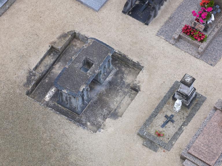 La suite du procès-verbal ajoute là encore à l’originalité des dispositions du sanctuaire de Minihy-Tréguier en précisant "qu’au milieu de ladite chapelle y a une tombe enlevée et en bocze la représentation de mondict sieur sainct Yves". Ce n’est donc pas dans ce cas d’un simple oratoire qu’il s’agit mais bien d’une chapelle funéraire abritant un tombeau, ou plus précisément un cénotaphe en forme de tombeau, en rappelant s’il en était besoin que le corps de saint Yves fut enseveli dès sa mort dans la nef de la cathédrale de Tréguier où le duc Jean V lui fit édifier dans la première moitié du 15e siècle un superbe tombeau. Ainsi la description fournie par le procès-verbal de 1601 permet de reconsidérer l’actuel "tombeau de saint Yves" qui fait face au portail ouest de l’église de Minihy-Tréguier. Sa forme atypique a entrainé des interprétations fantaisistes autant qu’erronées qui ont voulu y voir un ancien autel de l’église. Cette version n’est pas soutenable puisque le monument comporte un décor homogène sur ses quatre faces, alors que les anciens autels, toujours adossés et jamais isolés, ne sont ornés que sur leur face antérieure et leurs côtés. Même s’il a souffert des outrages des intempéries et des hommes, le décor d’arcatures du tombeau est encore très lisible. Les accolades à feuilles retournées qui surmontent des trilobes de même que la frise de feuillages qui orne sa corniche, caractéristiques de la seconde moitié du 15e siècle, coïncident parfaitement avec les armoiries de Christophe du Chastel, évêque de Tréguier de 1466 à 1479, mentionnées dans le procès-verbal sur les deux pignons de l’oratoire sous lequel se trouve alors le tombeau.