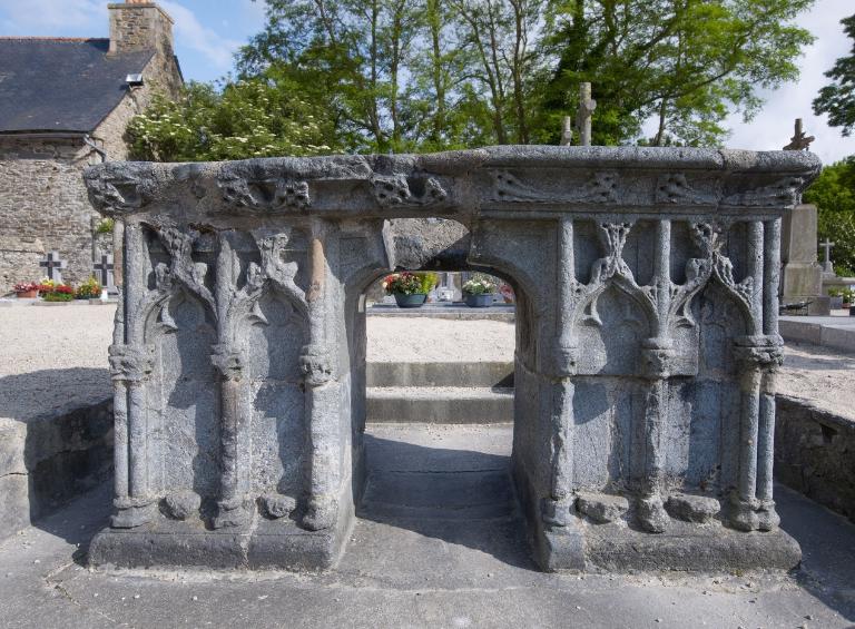 La forme étonnante de ce tombeau due essentiellement à l’arche formant passage qui le traverse ; est à l’évidence prévue dès l’origine puisque son arc à angles en quart de rond, soigneusement mouluré d’un cavet, est surmonté d’une courte frise de feuilles, inexistante en revanche au sommet des arcatures. Les témoignages anciens, les photographies de la fin du 19e siècle et le pèlerinage tel qu’il est toujours vécu aujourd’hui confirment le rituel du passage à genoux prosterné sous le tombeau afin de recevoir les bienfaits de la sainteté. Cette pratique religieuse devenue rare aujourd’hui était fréquente au Moyen âge et en particulier en Bretagne. On connait dans la crypte romane de l’ancienne abbaye Sainte Croix de Quimperlé, le tombeau de saint Gurloes, (en breton sant Urlou), invoqué contre la goutte, datable de la fin du 14e ou du début du 15e siècle et qui présente dans sa masse une large arcade permettant le passage des pèlerins à des fins de guérison. Un rituel identique existait à Plougrescant dans la chapelle de Saint-Gonéry où le tombeau-cénotaphe du saint est constitué du couvercle d’un ancien sarcophage porté par une balustrade au bout de laquelle un passage permettait aux fidèles de le traverser et de bénéficier de la protection du saint. Enfin, cette pratique aurait également existé pour le tombeau de saint Renan, commandé par le duc Jean V aux alentours de 1425-1430 et transféré quelques décennies plus tard dans la chapelle du Penity jouxtant l’église de Locronan.