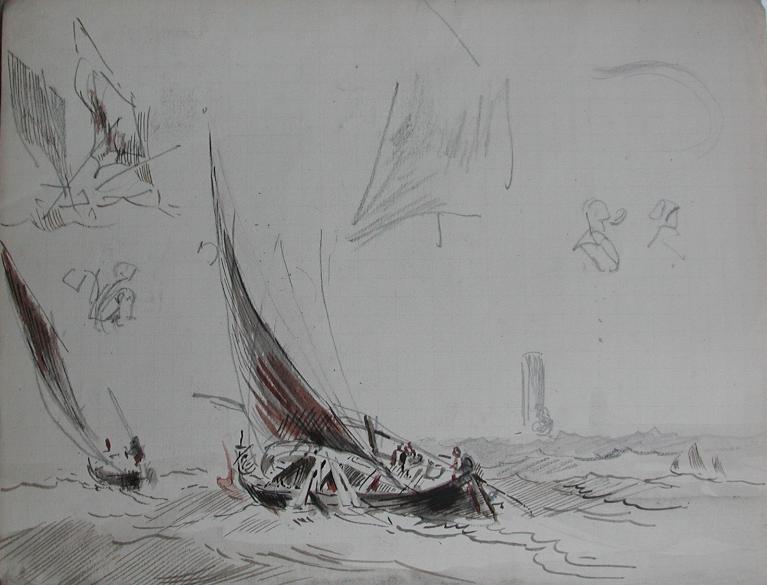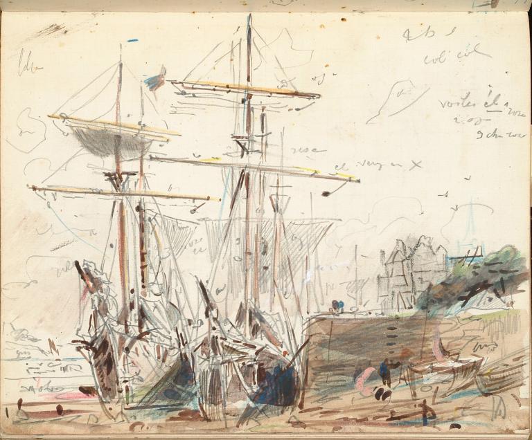 C’est davantage la vie grouillante des quais et des estrans qui séduit la riche palette de l’artiste, les scènes portuaires qu’il croque sur le vif, sur le motif, en utilisant ce que le douanier en exercice a sous la main : feuille de papier quadrillé, imprimé des douanes, morceau de carton, où il va rapidement esquissé et mettre en couleur telle manœuvre sous voiles, le halage d’une lourde embarcation, le déchargement d’une galéasse avec son mât de charge, les échouages dans la glaise bleue des grèves, les postures, les attitudes des marins…