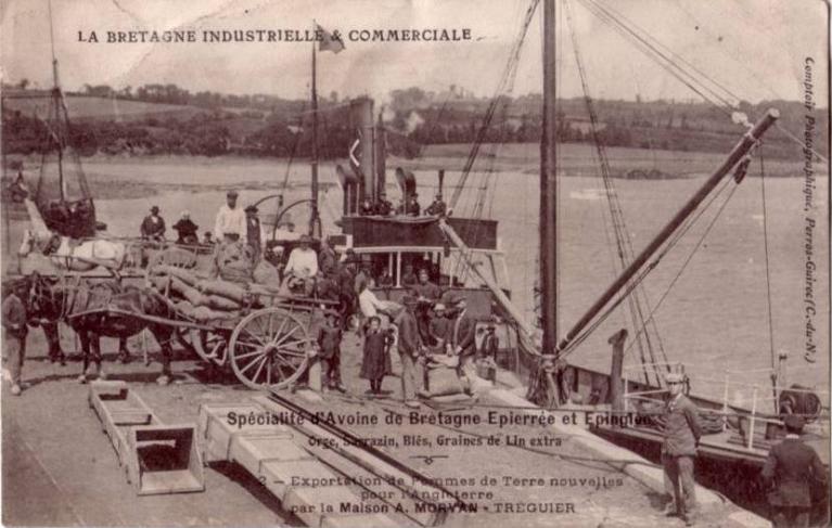 Les exportations concernent 103 navires (5 400 tonneaux) qui se rendent à l’étranger ou à la grande pêche, les 463 autres (près de 8 000 tonneaux), commercent vers les ports de la Bretagne Nord, des Flandres et de Normandie, mais se rendent aussi à Bordeaux ou à Bayonne. Ils sont chargés de pommes de terre, de céréales ou de farines. En 1908, Tréguier est le 9ème port français. La situation est inchangée 25 ans plus tard. En 1909, le premier produit importé à Tréguier est le bois de construction (près de 75 000 quintaux), suivi de la houille (45 000 quintaux) et des engrais chimiques venant de Hollande ou de Belgique (6 500 quintaux). Le port exporte 115 000 quintaux de pommes de terre primeur (la fameuse Duc, semence fermière) vers les côtes anglaises et 1 500 quintaux de goémon. Les paysans apportent au port leur production de pommes de terre, afin de les faire peser et d’assister à leur embarquement. Cette « saison de la patate » constitue avec le pardon de Saint-Yves au mois de mai l’un des moments forts de la vie de la ville.