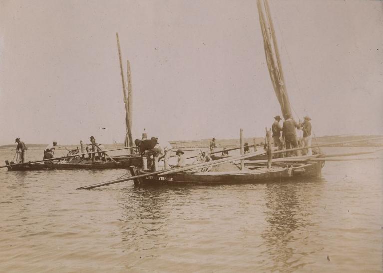On peut remarquer la grand-voile amurée au pied de mât. Le point d’écoute est très reculé. La perche de drague est à poste, appuyée sur la fourche du mâtereau, sous le vent. Ces bateaux vont être remplacés au cours de la 1ère moitié du 20e siècle par des misainiers, canots creux ou demi pontés de 6 m maximum de longueur de coque. Ces canots pouvaient changer de gréement pendant l’été avec un gréement à corne pour les pêches côtières. De petits borneurs gréés en sloop vont également faire le sable et le goémon autour des îles d’Er et à l’échouage à l’Île Blanche, près du Sillon de Talbert.