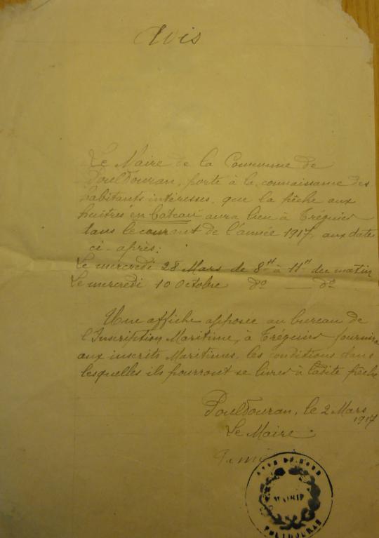 En 1832 l’Amiral, préfet maritime de Brest, établit un rapport suite à la formation d’une commission. Il demande, vu l’état nécessiteux des familles, de permettre la pêche en bateau six jours par semaine (la pêche à pied étant interdite) et que sa clôture soit fixée à la fin du Carême (22 avril). De même, il veut désigner au quai un point unique où tous les bateaux pêcheurs seraient tenus de décharger leurs huîtres ; et si celles-ci sont inférieures à cinq centimètres (taille minimale des huîtres marchandes) obligation leur est faite de les rapporter immédiatement sur le banc : pour cela un gendarme doit être présent. Le préfet note de plus :