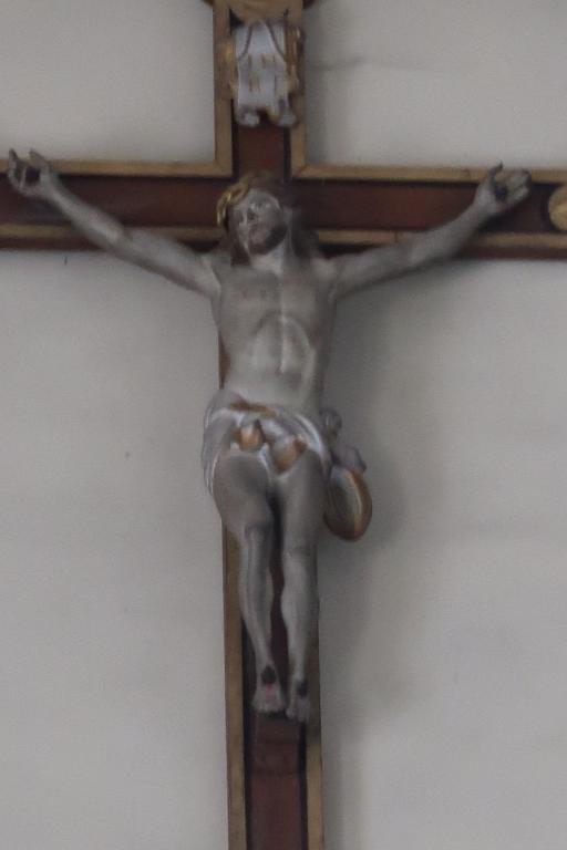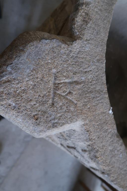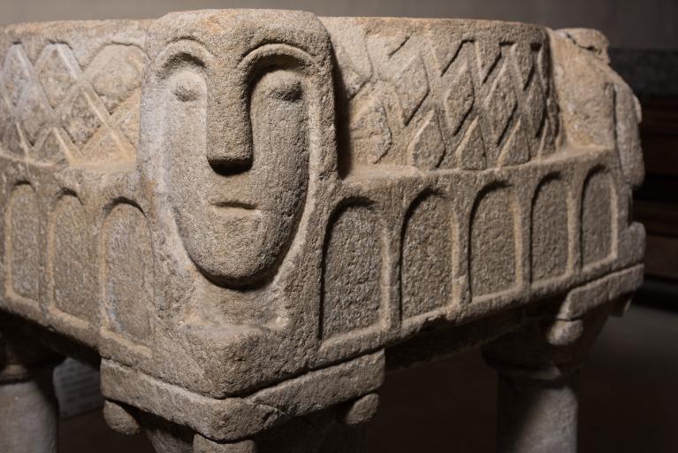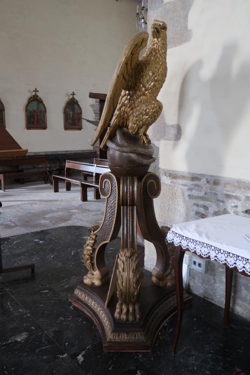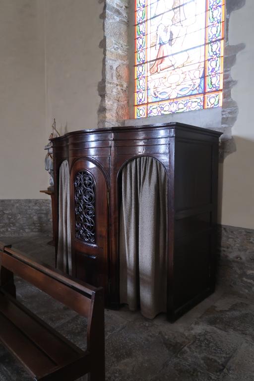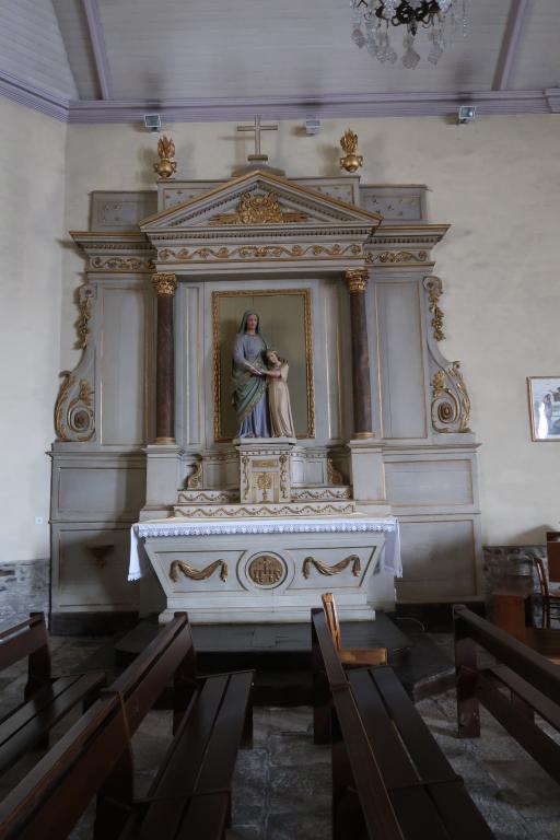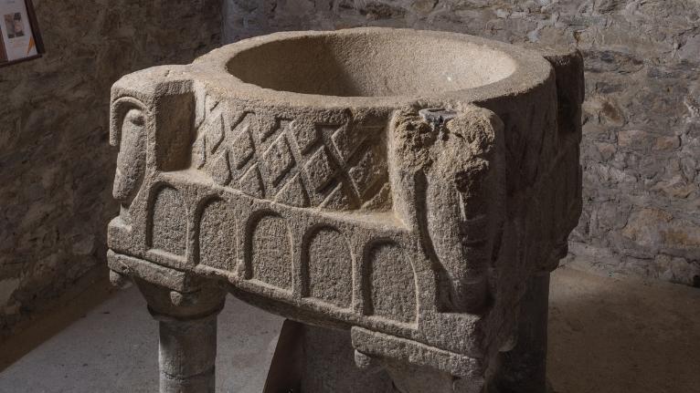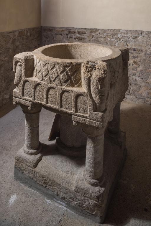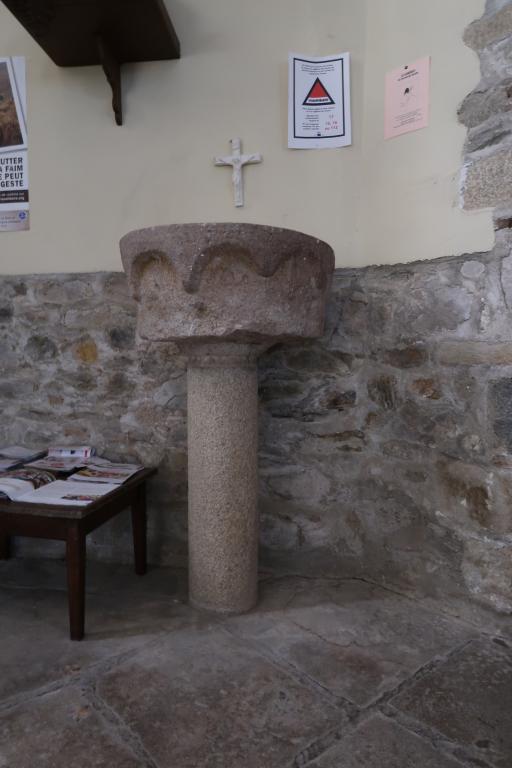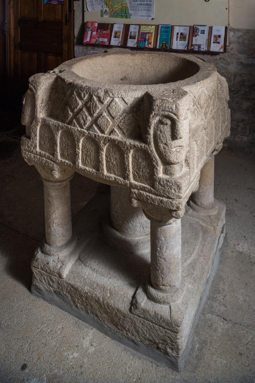 Les fonts baptismaux, déposés en bas de nef, sont d’époque romane. La cuve circulaire taillée dans un gros bloc de granite de section carrée est portée par un pilier central et quatre autres colonnes à chapiteaux. Le décor de la cuve organisé en deux registres avec quatre têtes en armure, aux angles, n’est pas sans rappeler, avec une iconographie simplifiée, celle de Zedelgem en Belgique ou encore les fonts baptismaux de Theux.