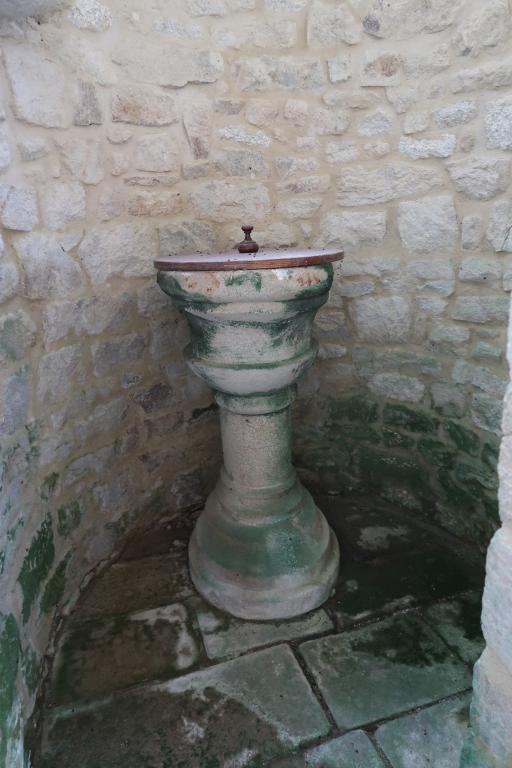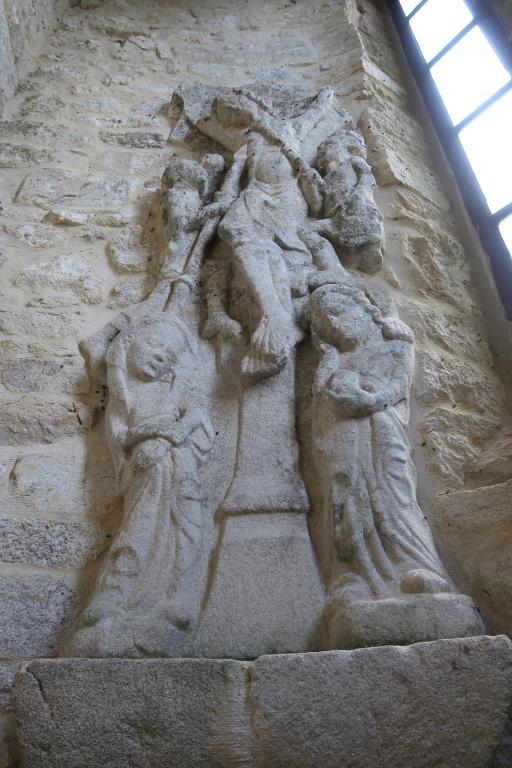 L’intérieur réserve quelques surprises, comme la conservation dans la tour d’un autre calvaire, quoique mutilé, mais d’une très belle facture. L’expression des personnages, le déhanchement prononcé de la Vierge, la position et la représentation du Christ incite à une datation également du 14e siècle. Il s’agit en fait du calvaire de l’enclos paroissial qui fut abattu lors d’une tempête en 1954. Ainsi ces deux calvaires font partie, avec celui nommé, la croix Orin, situé non loin, des plus anciens de Haute Bretagne.