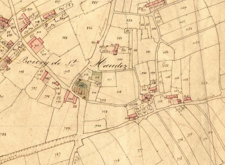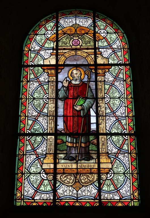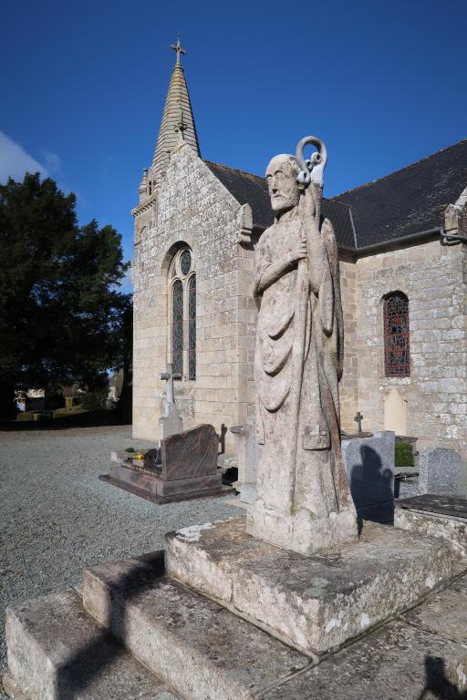 L’église de Saint-Maudez, forme un ilot préservé, légèrement excentré du bourg. Elle a maintenu son enclos paroissial d’où jaillit vers l’est un calvaire. Ce dernier très ancien, remonte, hors l’emmarchement, du début du 14e siècle, il a été repris au 18e siècle (vers 1774), lors de la reconstruction totale de l’église. Cette dernière, entièrement en pierre de taille de granite, réemploi, dans son gros œuvre, quelques vieilles pierres sculptées. Le clocher-porche en bas de nef date de la fin du 19e siècle, il est commencé en 1875.