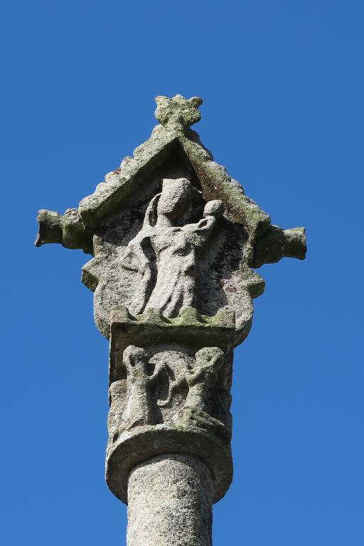 "Remontée au 18e siècle sur un emmarchement qui en accroit encore le caractère imposant, elle s’élève sur une puissante base prismatique moulurée, entourée par une table carrée portée par des colonnettes dont les bases et les chapiteaux à crochets bourgeonnés sont bien du 13e siècle finissant ; au-dessus de la table, le départ du fût est constitué d’un large tambour monolithe circulaire sculpté de neuf personnages agenouillés, dont les tuniques longues trahissent la même époque ; le fût, de section ronde, est très élancé et se termine par un petit tambour formant chapiteau, orné lui de six personnages agenouillés ; au sommet, enfin, un panneau quadrilobé sous un auvent fleuronné porte à l’est une Vierge à l’enfant et à l’ouest le Christ en croix entre Marie et saint Jean. L’ensemble est très cohérent par le matériau, la facture et les proportions : il ne s’agit donc pas, comme cela a pu être dit, d’un monument composite fait de pièces et de morceaux."