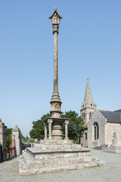 Cette croix historiée, d’époque gothique, réinstallée en 1774 (socle à plusieurs degrés) lors de la reconstruction de l’église présente plusieurs particularités : son ancienneté, son iconographie et sa disposition sur un axe pivotant. Elle fait partie des plus anciens calvaires connus de Haute Bretagne. Marc Décenneux dans la Bretagne des enclos et calvaires n’hésite pas à proposer une datation autour de 1300 et à réhabiliter son appellation de « croix des templiers ».