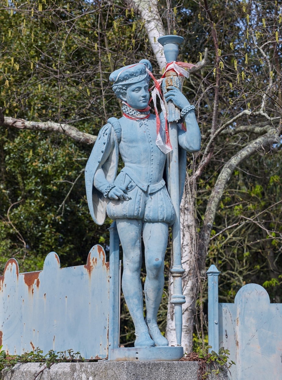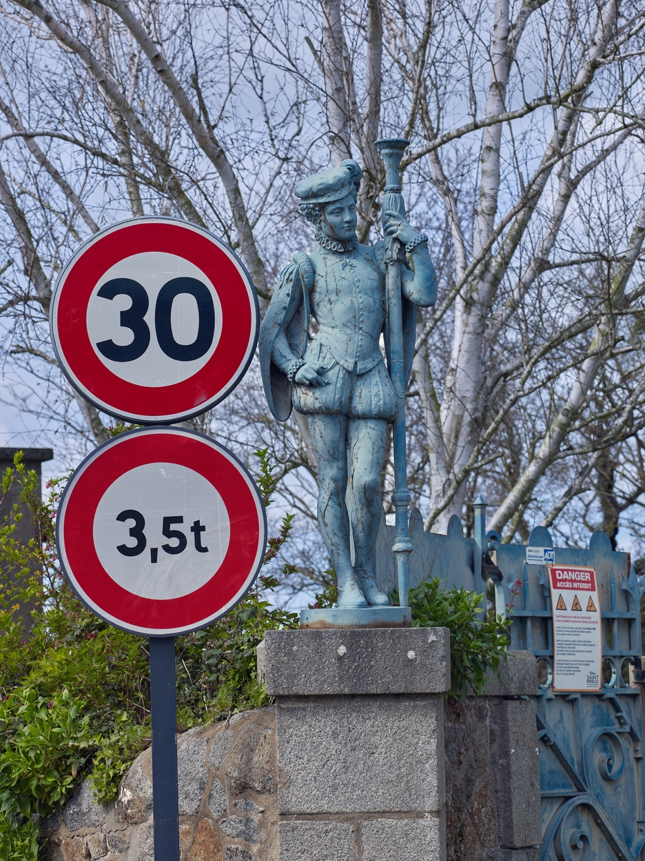 Encadrée par deux grands piliers en granite gris coiffée en bâtière, la porte charretière se compose d’une grille en fer forgé, en partie pleine, à deux battants. Des grilles défensives latérales en arc de cercle protègent les deux grands piliers de l’escalade. De part et d’autre de l’espace en demi-cercle, sur des piliers bas, se dressent deux statues de page en fonte moulée. Les personnages arborent une tenue vestimentaire dans le style Renaissance : souliers, chausse courte bouffante à mi-cuisse, pourpoint, cape, collerette, toque à plume et lance. La lance pourrait avoir accueilli un dispositif d’éclairage électrique de type globe.