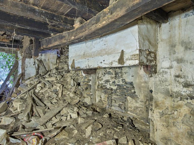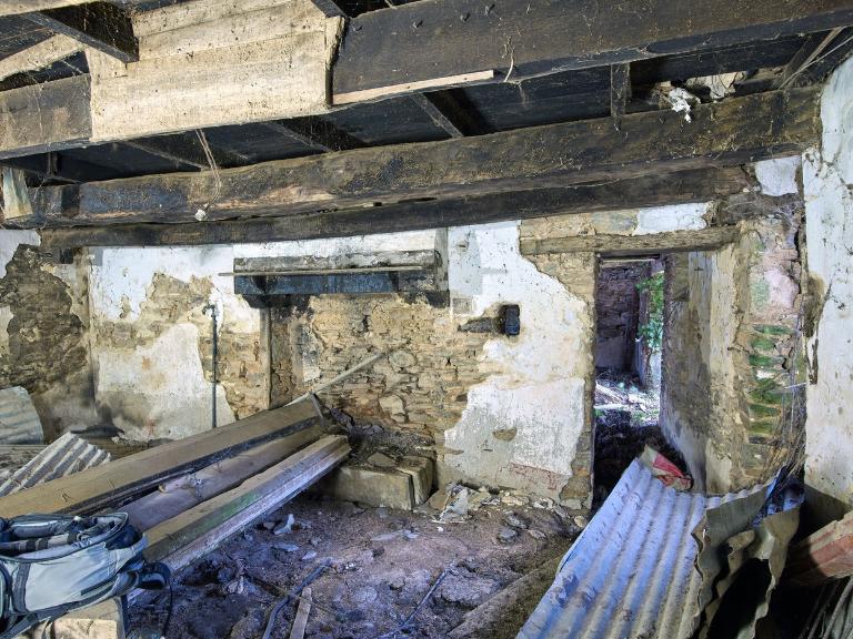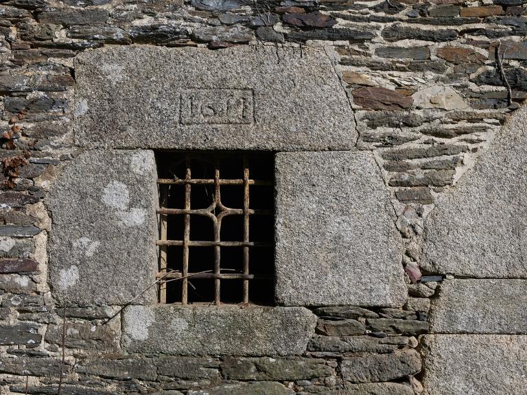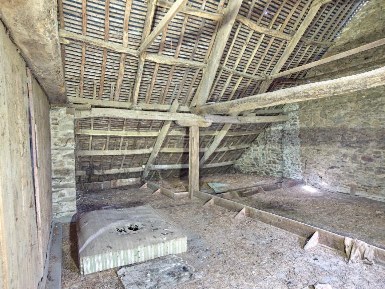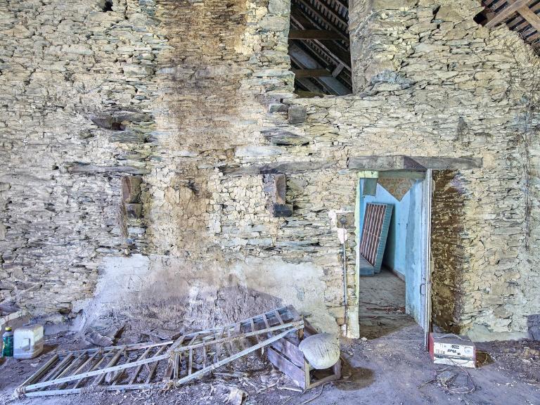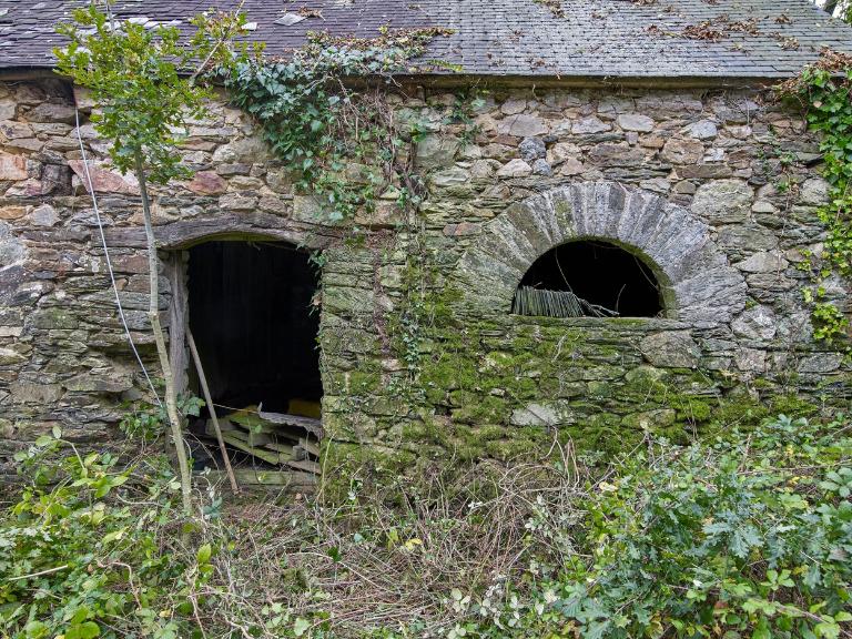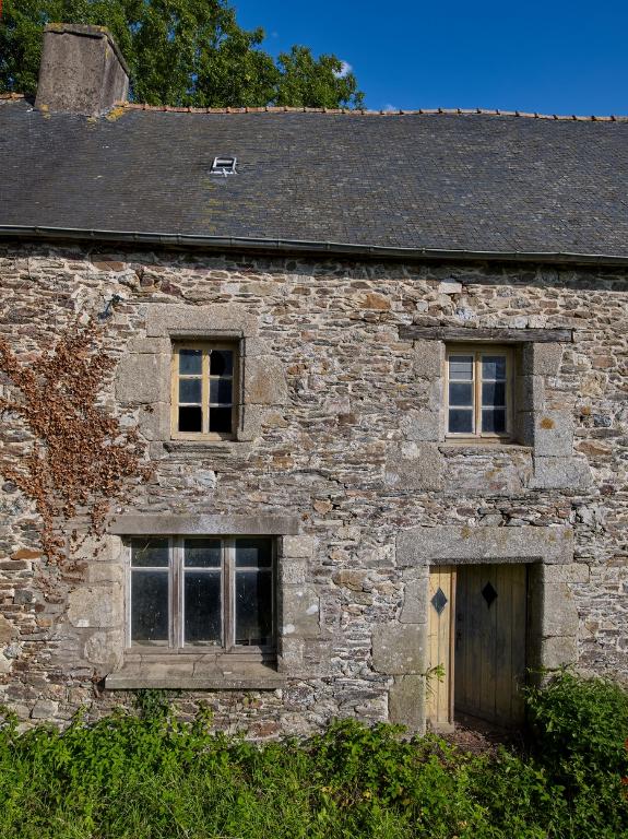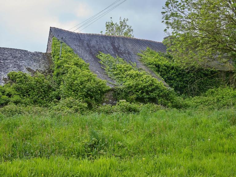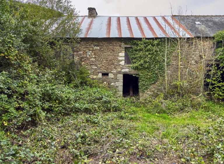Alignement composé de deux logis et de plusieurs dépendances en moellons de schiste. Le logis le plus ancien présente un plan allongé à étage qui abrite plusieurs fonctions : une partie habitation - à salle et chambre superposées - et une partie probablement dévolue au conditionnement des toiles, à porte charretière et appentis postérieur très profond, soutenu par un système de poutraison et de poteaux. Les deux parties - habitation et dépendance pour les toiles - ne sont séparées que par une cloison en bois. Le second logis est construit à l'ouest, dans le prolongement du premier logis. Il présente un plan massé à salle et chambre superposées qui communiquent avec celles du premier logis. L'emplacement d'un escalier en vis est visible dans le renfoncement du mur nord de la chambre. Une dépendance à porte charretière est construite dans le prolongement à l'ouest. La remise construite en alignement à l'est présente un côté ouvert soutenu par des poteaux de bois.
