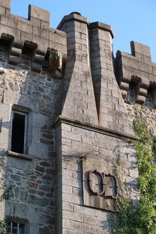 L’élévation Ouest (en réalité, Ouest-nord-ouest), côté Gouët et Port du Légué est traitée de façon magistrale : implantée de plain-pied, la porte axiale percée dans l’étage de soubassement à fruit, est surmontée d’une bretèche ornée d’un arc brisé se terminant par deux souches de cheminées de forme octogonale. A la manière des niches à armoiries surmontant les portes des manoirs et châteaux, l’ancre de façade - positionnée sur une pierre de taille démesurée - arbore les initiales "OD" pour Ollitrault-Dureste, propriétaire du domaine et commanditaire des travaux. Deux des quatre merlons sont percés d’une embrasure (fente de visée et ouverture circulaire). Pour parachever l’ornementation de cette tour/conciergerie, les exutoires du toit sont deux gargouilles néo-médiévales disposées sur les élévations Ouest et Nord.