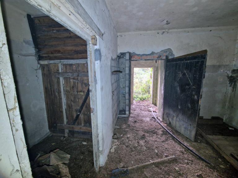 - à l’est, un couloir (l 3,97 x la 1,60 m x h 2,77 m), fermé au sud par une porte en bois située un peu en retrait. Le couloir dessert une petite pièce (nommée A) de plan rectangulaire située au nord (l 1,98 x la 2,77 m x h 2,77 m) ; au milieu du couloir, sur la gauche, se trouve une ouverture (la 0,89 m) donnant sur la pièce ouest (nommée B). La petite pièce nord est éclairée par une unique fenêtre orientée vers le nord, implantée au milieu du mur ; la porte d’accès mesure 0,6 m de largeur.