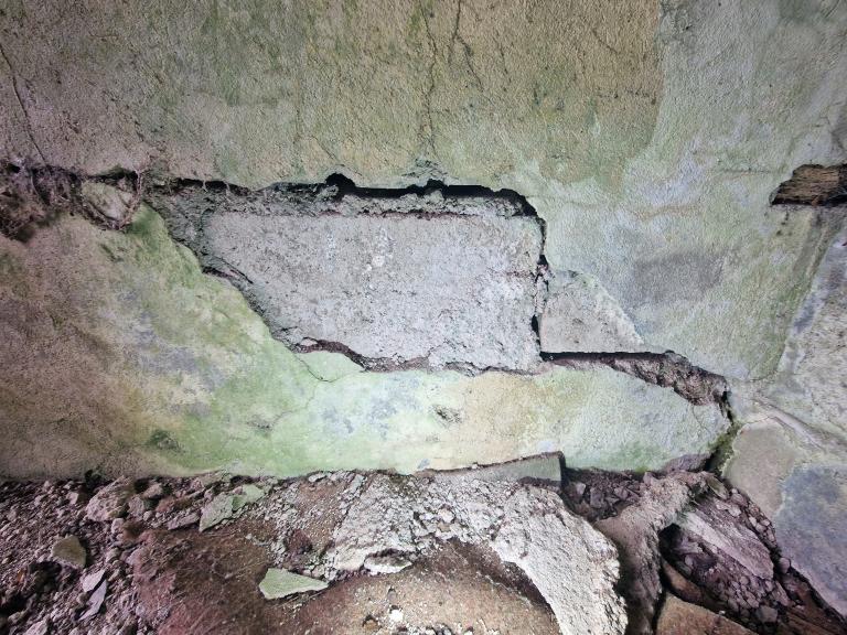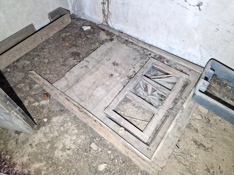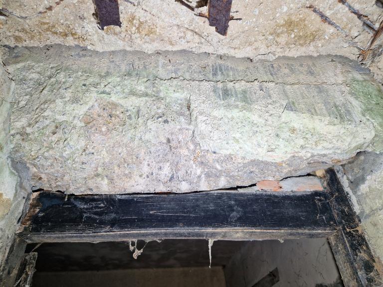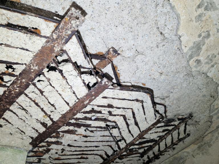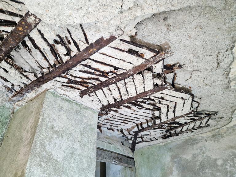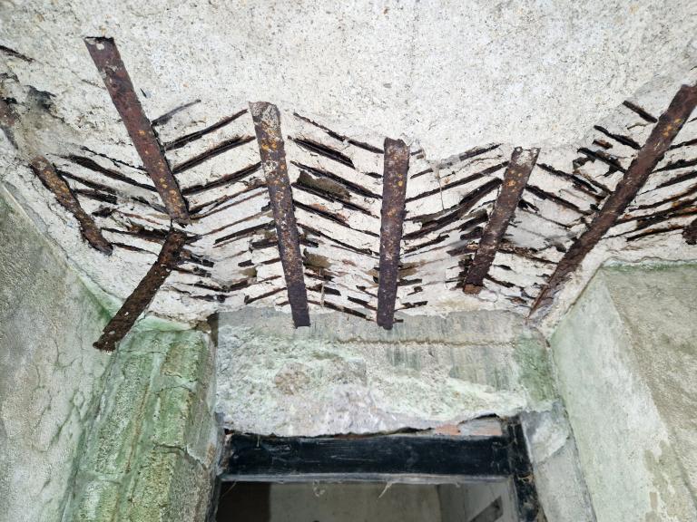 Le ferraillage de la dalle de couverture du vestibule - en béton armé de 0,20 m d’épaisseur - est constitué de grilles métalliques de roulement pour piste d’avion. Elles sont observables du fait de la corrosion qui, en attaquant l’acier du ferraillage, a fait éclater le béton.