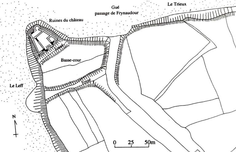Le château de Frynaudour est idéalement situé sur un éperon rocheux à la confluence du Leff et du Trieux. Il contrôle un gué/bac mais aussi la remontée de la rivière de Pontrieux. Sa création, remontant peut-être au 12 siècle, est attribuée à la famille de Kergorlay.