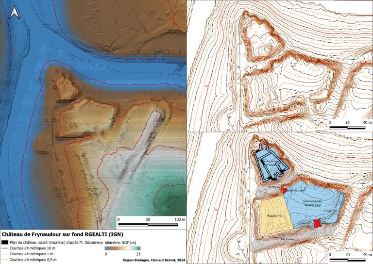 Le modèle numérique de terrain couvrant le château, en lien avec la visite de terrain, permet de distinguer un château structuré autour de deux enceintes culminant de 6 à 8 m au-dessus des fossés. Elles forment deux ensembles isolés par deux fossés successifs.