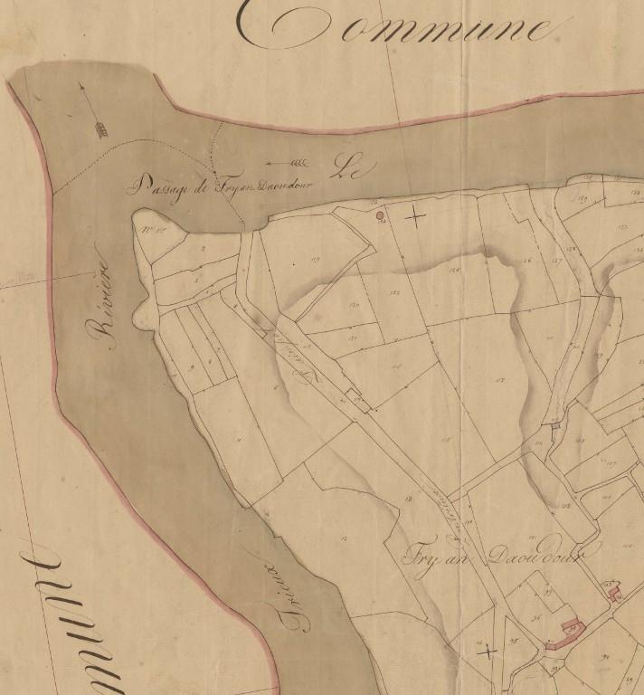 Sur le cadastre parcellaire de 1832, le gué et bac sont figurés avec la mention "Passage de Fry an Daou dour". Il est possible de franchir le Leff, mais aussi le Trieux d’est en ouest (sur l’autre rive, un chemin puis une route secondaire permettent de rejoindre la route de Pontrieux à Lézardrieux). Un colombier figure dans la parcelle n° 122.