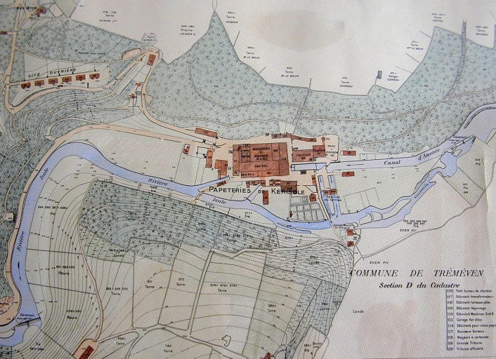 Plan général des papeteries de Mauduit levé par Troalen, ingénieur des travaux publics. Indications précises sur la topographie et la fonction des différents espaces et bâtiments, avant les transformations contemporaines.