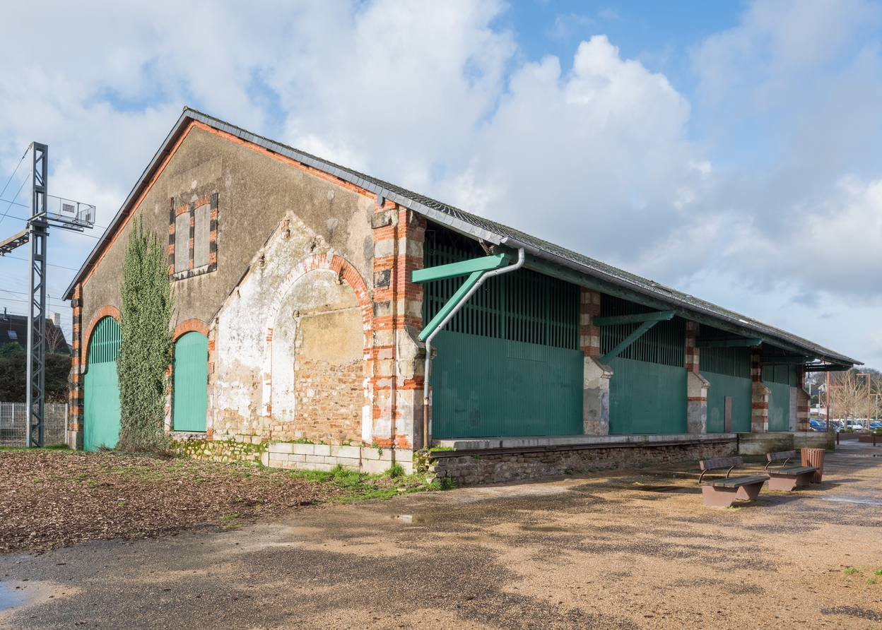 Construite à l´ouest de la ville haute, la gare de chemin de fer, conçue suivant un modèle national, a été inaugurée en 1863. Construit en calcaire et brique, le bâtiment central des voyageurs, à étage, est flanqué de pavillons latéraux en rez-de-chaussée. L´ancien logement du chef de gare se situait à l´étage. L´enduit, refait à l´époque contemporaine, couvre le gros-oeuvre d´origine. Datant de la même époque, la remise ferroviaire à usage de gare de marchandises est actuellement désaffectée. L´apogée de la gare se situe entre 1880 et 1940 ; outre le transport de voyageurs, elle assurait l´importation de produits divers, notamment des matériaux de construction et du vin ainsi que l´exportation des produits agroalimentaires et industriels fabriqués sur place (bois, pommes à cidre, matériel agricole, papier, conserves), activité en déclin. Aujourd´hui, le trafic de voyageurs demeure dense, avec plusieurs arrêts par jour du TGV Paris Quimper.