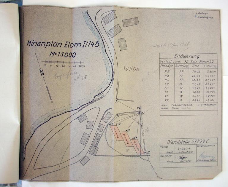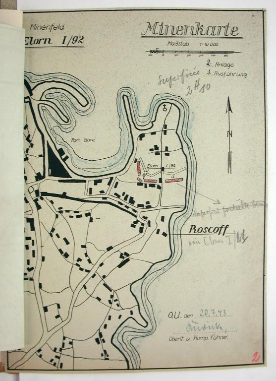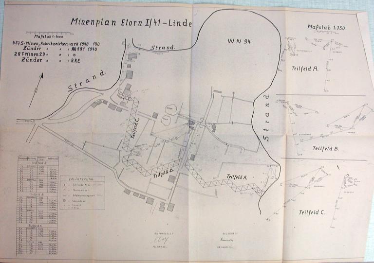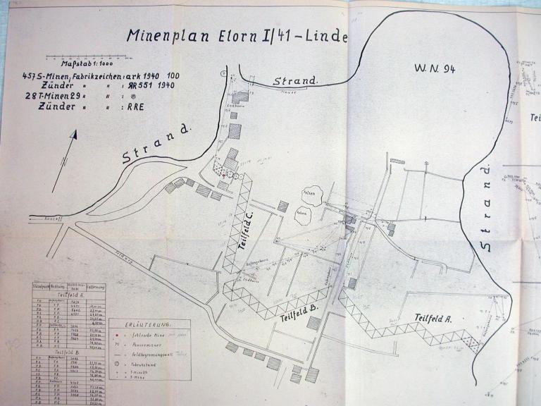 - champ de mines Elorn I/41 "Linde" (tilleul) divisé en trois sections A, B et C posé le 20 février 1943 au-delà d'An Diou Roc’h (les deux roches). C’est vraisemblablement dans ce secteur que ce trouve le bunker baptisé "Felsen" (rocher).