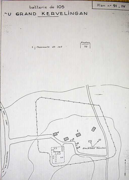 Dans le rapport Pinczon du Sel sur les installations du Mur de l'Atlantique (1946-1949), la batterie d’artillerie est associée à tort au toponyme Le Grand Kerveleugan orthographié Kervelingan. Le rapport comprend une description, un plan schématique et la photographie de l’un des quatre bunkers-casemate dont le canon apparaît sabordé.
