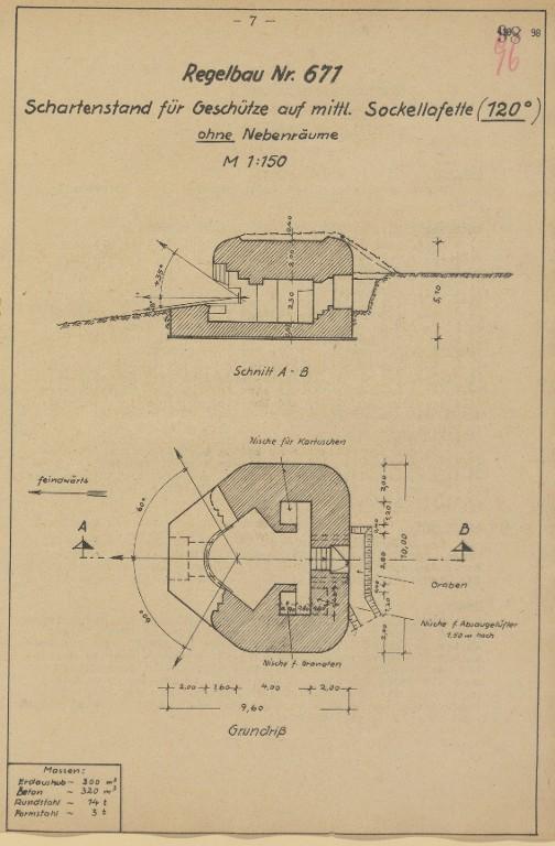 Schartenstands für Geschütze auf mittlerer Sockellafette (120°) ohne Nebenräume (Regelbau 671).